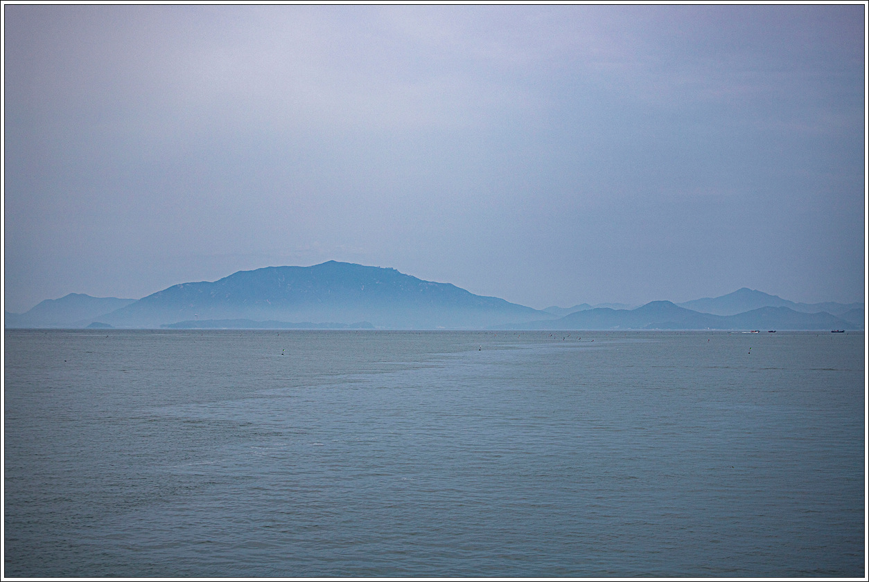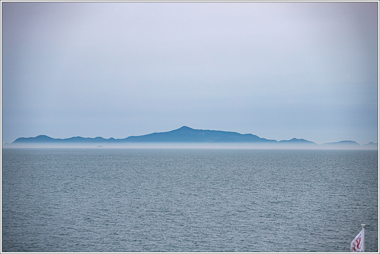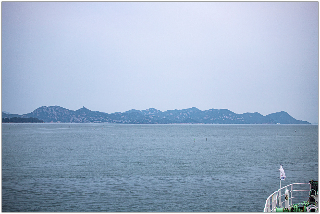 ▽ 오늘 도착하자마자 산행을 먼저 할 초도 동쪽에 위치한 손죽도가 또한 그 모습을 드러냈다. 맨 왼쪽의 검은 섬이 무학도, 바로 오른쪽으로 가장 높게 보이는 산이 소거문도의 산이고 그 오른쪽부터가 길게 손죽도이니 모두가 겹쳐 보여서 한 섬으로 보인다.
