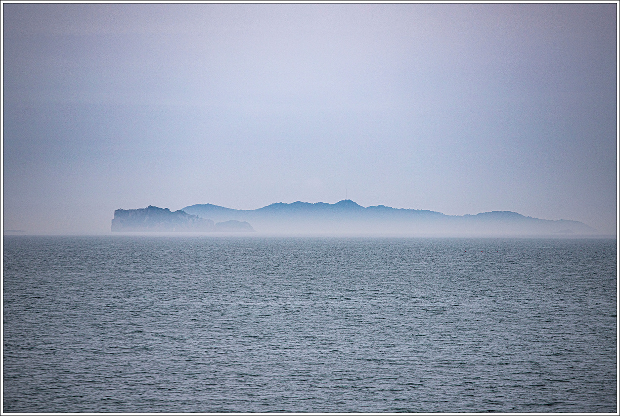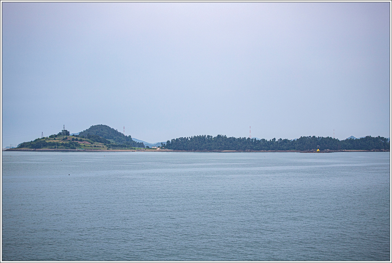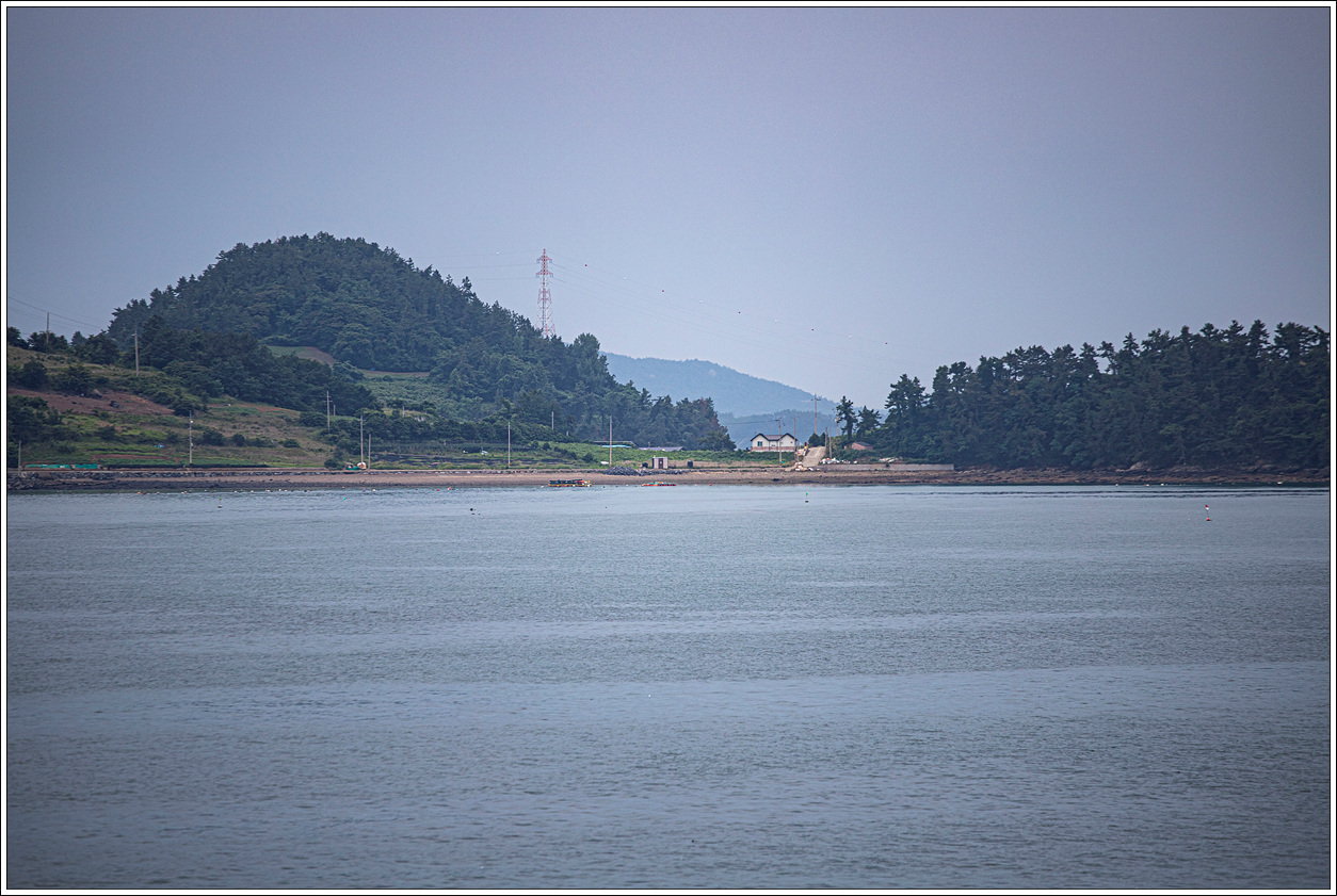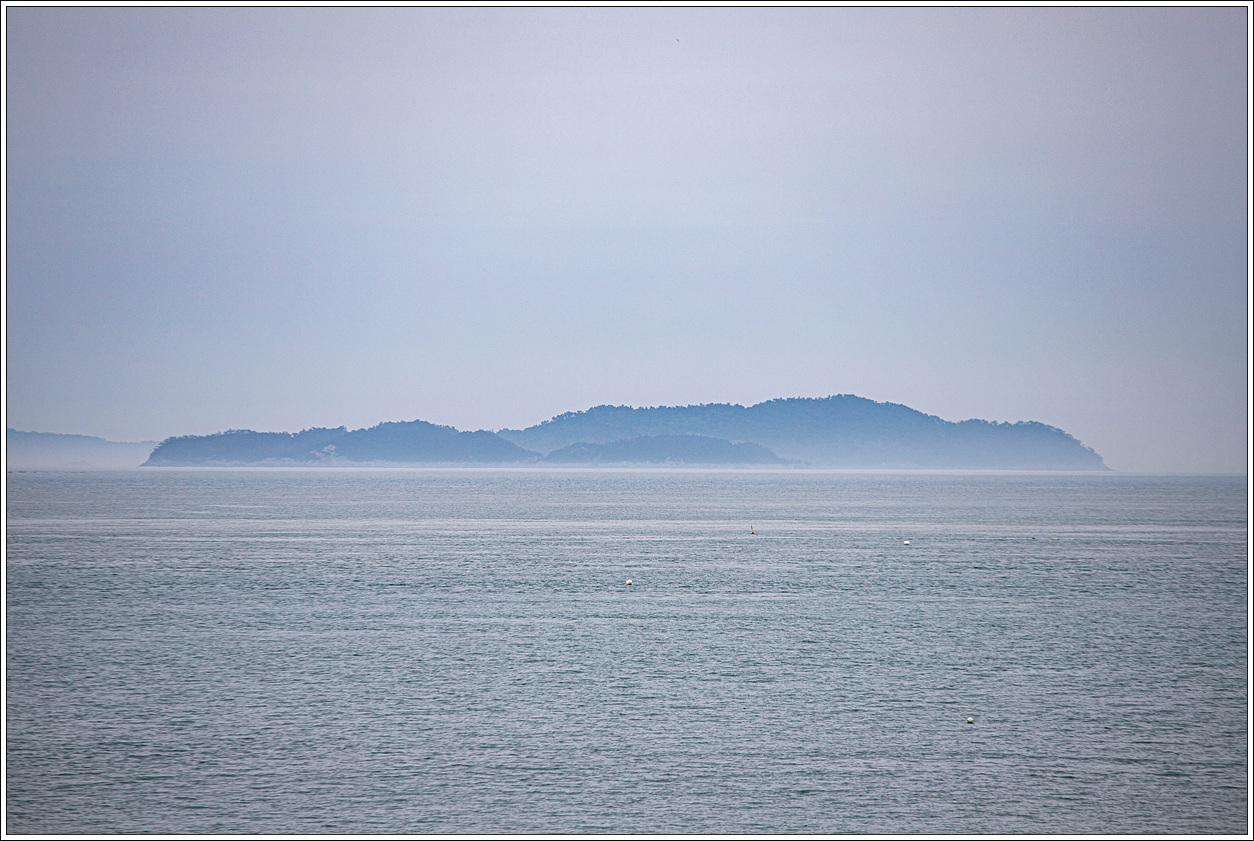 ▽ 섭도의 동쪽으로 앞쪽 대병풍도와 뒷편에 길게 장도가 해무에 가려져 있다.