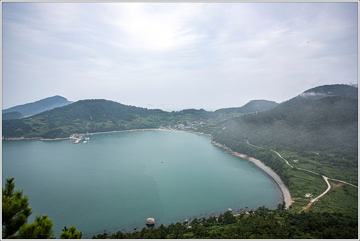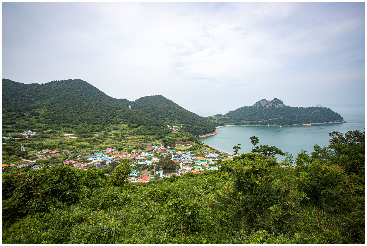 ▽ 첫 번째 봉우리에서 조망해 본 손죽도 풍경...맞은편에 손죽도항이 보이고 그 오른쪽으로 손죽리 마을이 보인다. 해변을 따라 해변길이 보인다. 저곳 선착장까지 40여분 남았으니 정말 뛰어 가다시피 해야할 것 같다.