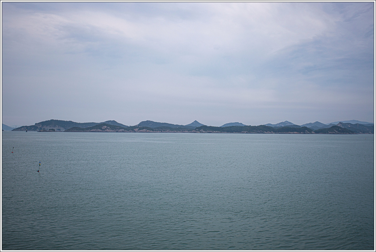 ▽ 서쪽 방향으로 바로 옆의 비견도를 지나면서 뒷쪽의 금당도와 함께 겹쳐져서 구분이 안되지만 가운데 송곳같이 뾰족한 섬은 금당도의 봉자산일 듯하다. 그 오른쪽이 오봉산, 삼랑산, 맨 오른쪽은 금당도 너머로 장흥의 천관산...이렇듯 실제 가 보지 않고는 산 이름을 짚기가 쉽지 않다.