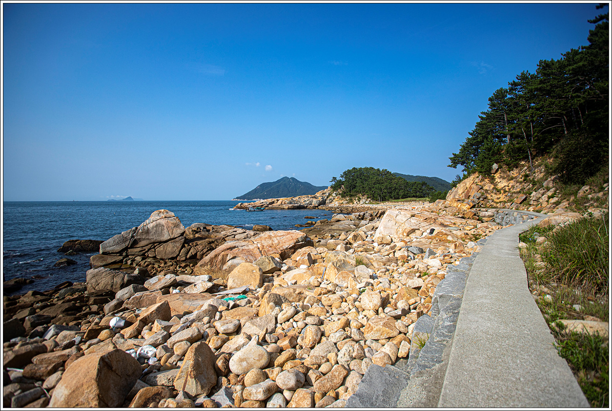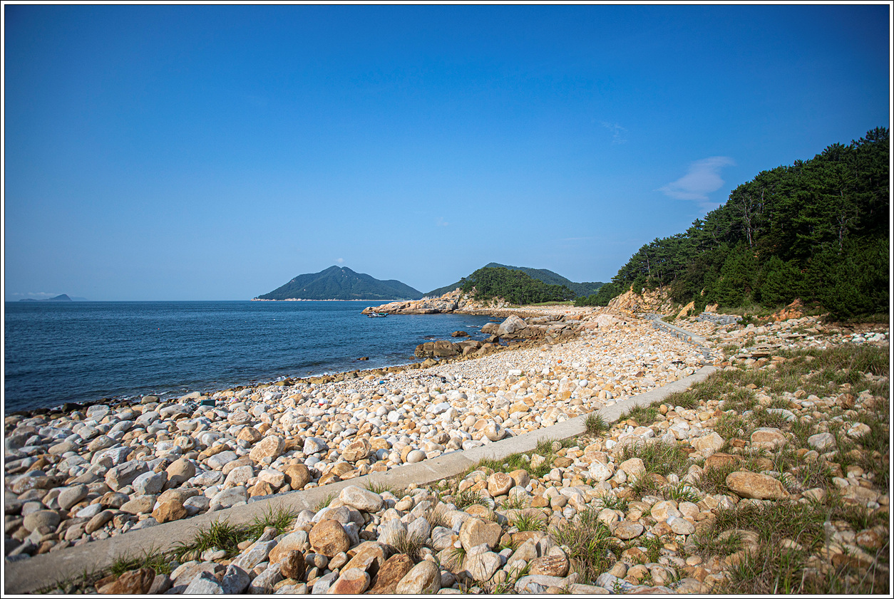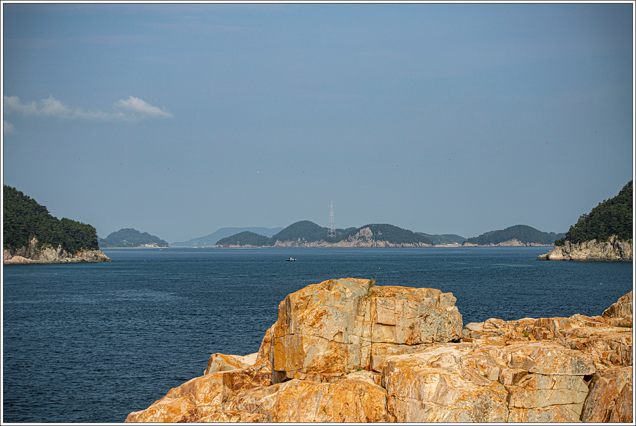 ▽ 예정된 코스로 해변으로 내려왔다면 이쪽편으로 오면서 더 볼거리가 있었을텐데 하는 아쉬움이 남는다. 왼쪽 비진도와 오른쪽 용초도 사이로 만지도, 학림도 일부가 살짝 보인다.