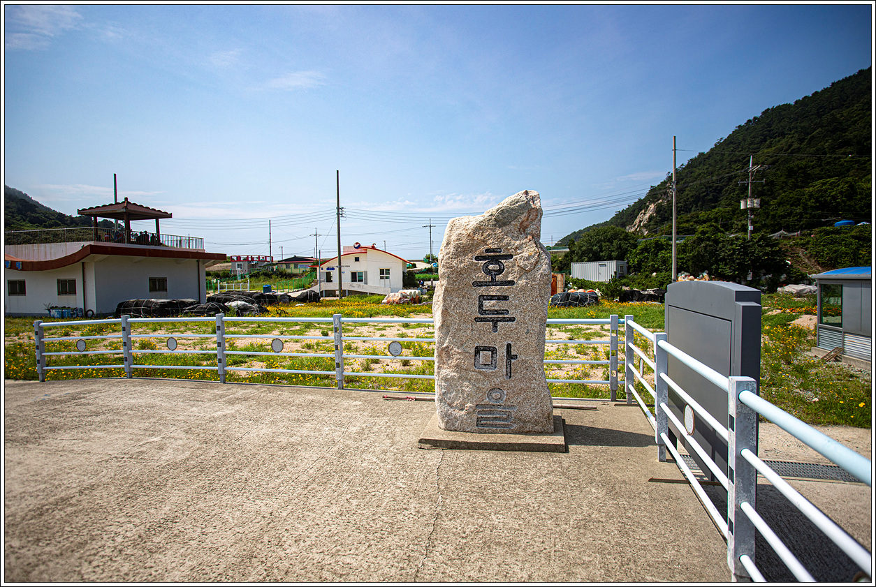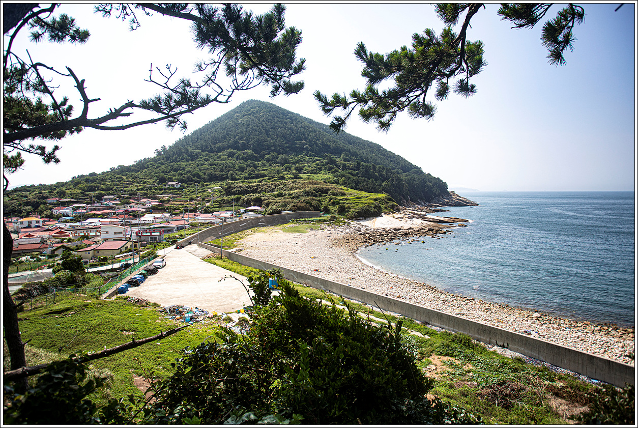 ▽ 어느 정도 숲길을 나오게 되면 이와 같은 호두항 풍경을 만나게 되고 폭풍의 언덕 일부가 보이게 된다. 바람 한 점 없는 산행을 하다가 저 앞에 소나무쪽으로 이동을 하니 그때서야 바닷바람을 맞으며 땀을 식힐 수가 있었다.