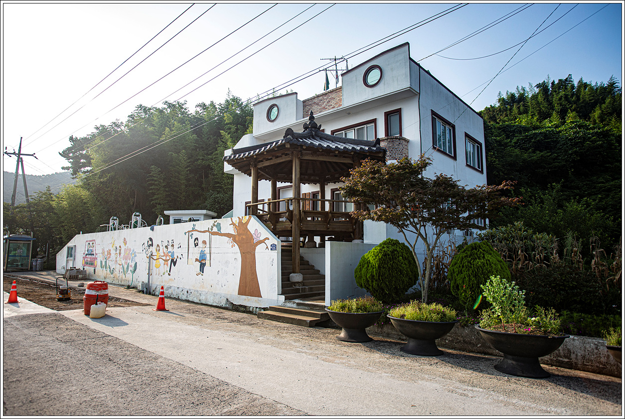 ▽ 용초마을회관 건물이 정자와 함께 멋지게 건립됐다. 이 건물 왼쪽 끝 대나무 숲으로 오르는 등로가 있다.