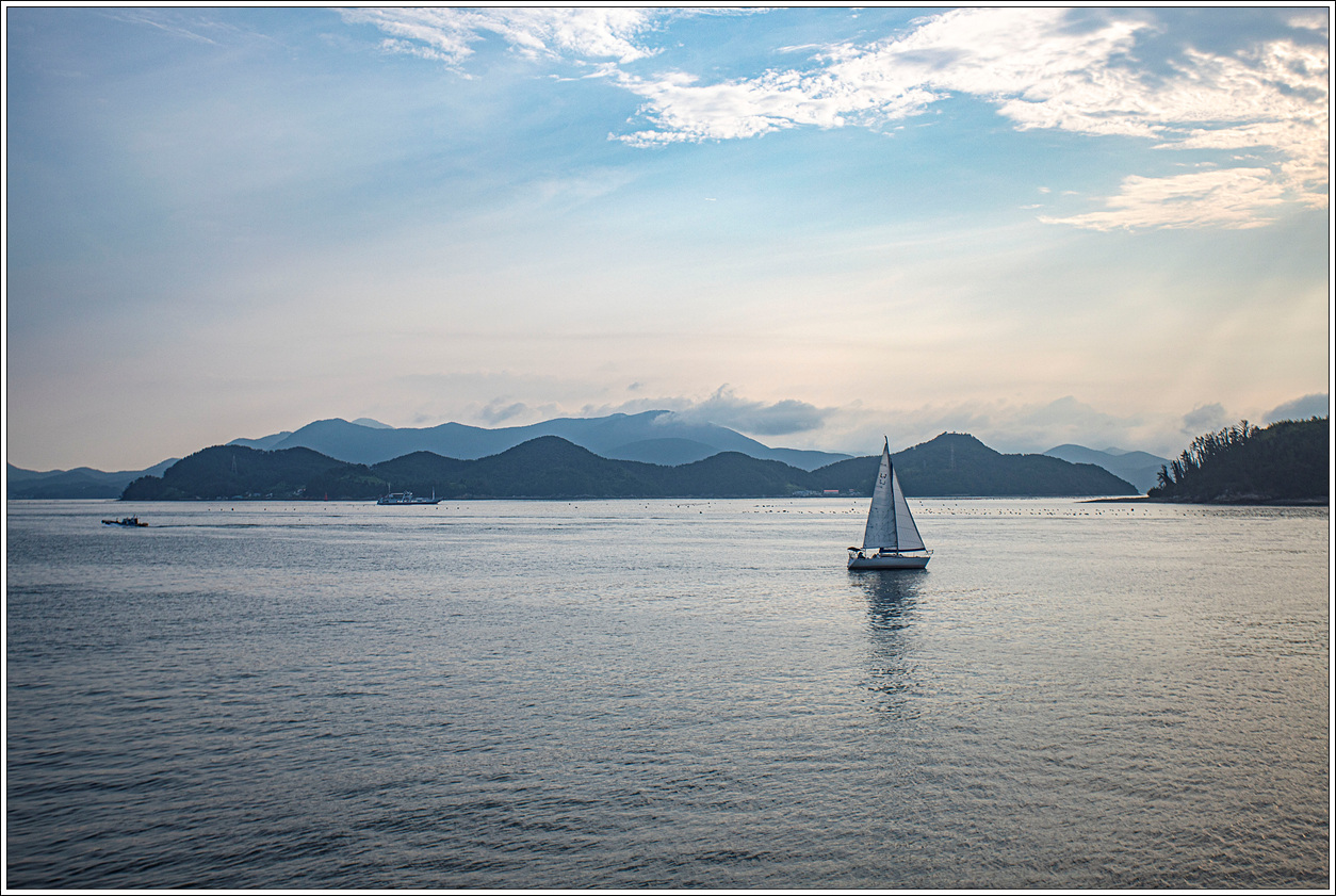 ▽ 이런 풍경 한컷만 담아도 즐겁고, 꼭 산행이 아니더라도 오가며 보는 것만으로도 힐링이 되기에 섬을 자주 찾게 된다. 요트 뒤로 보이는 섬은 거제시 둔덕면에 속하는 화도이다.