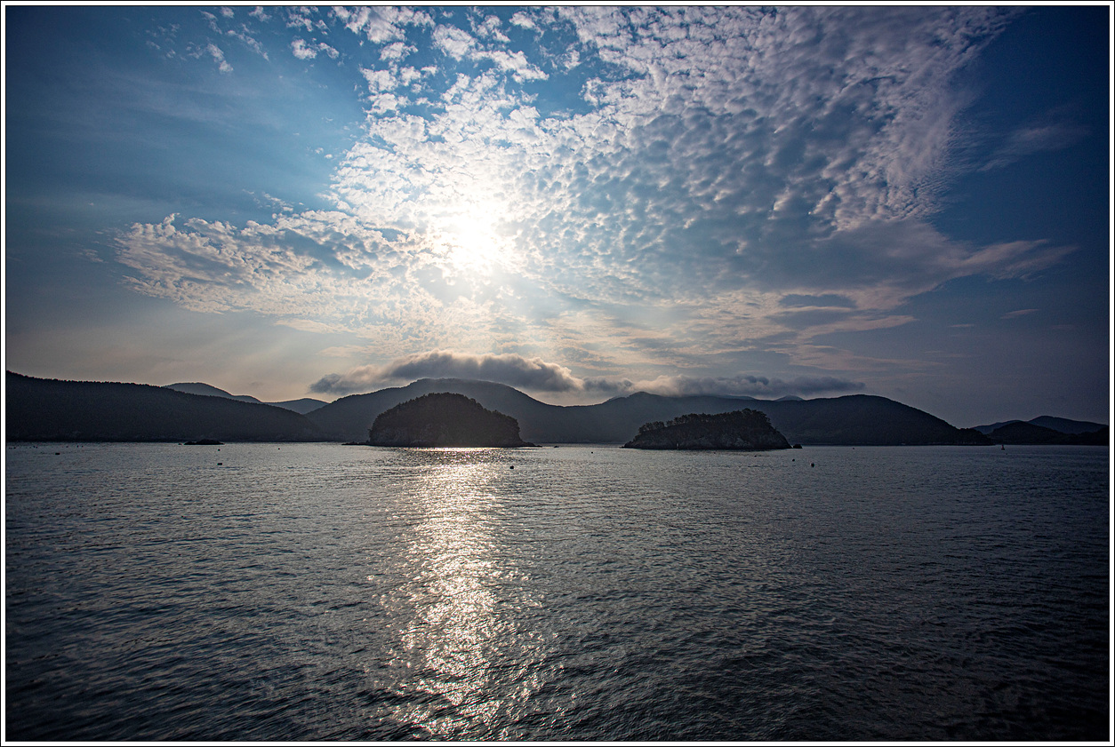 ▽ 오징어잡이에 나섰던 배일까? 갈치낚시를 갔다 왔을 수도 있겠다. 등을 잔뜩 단 어선이 통영항을 향해 힘차게 달린다.