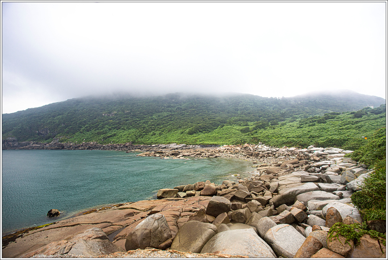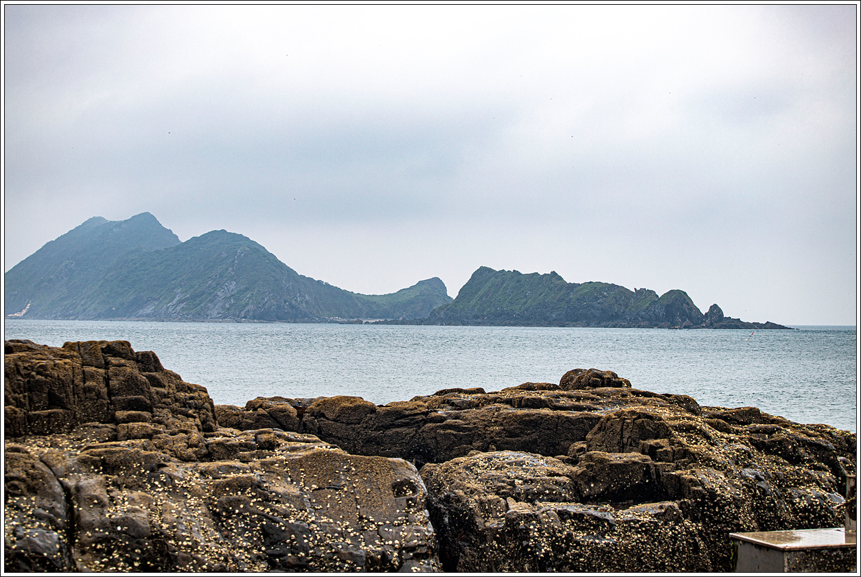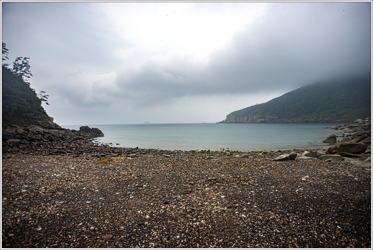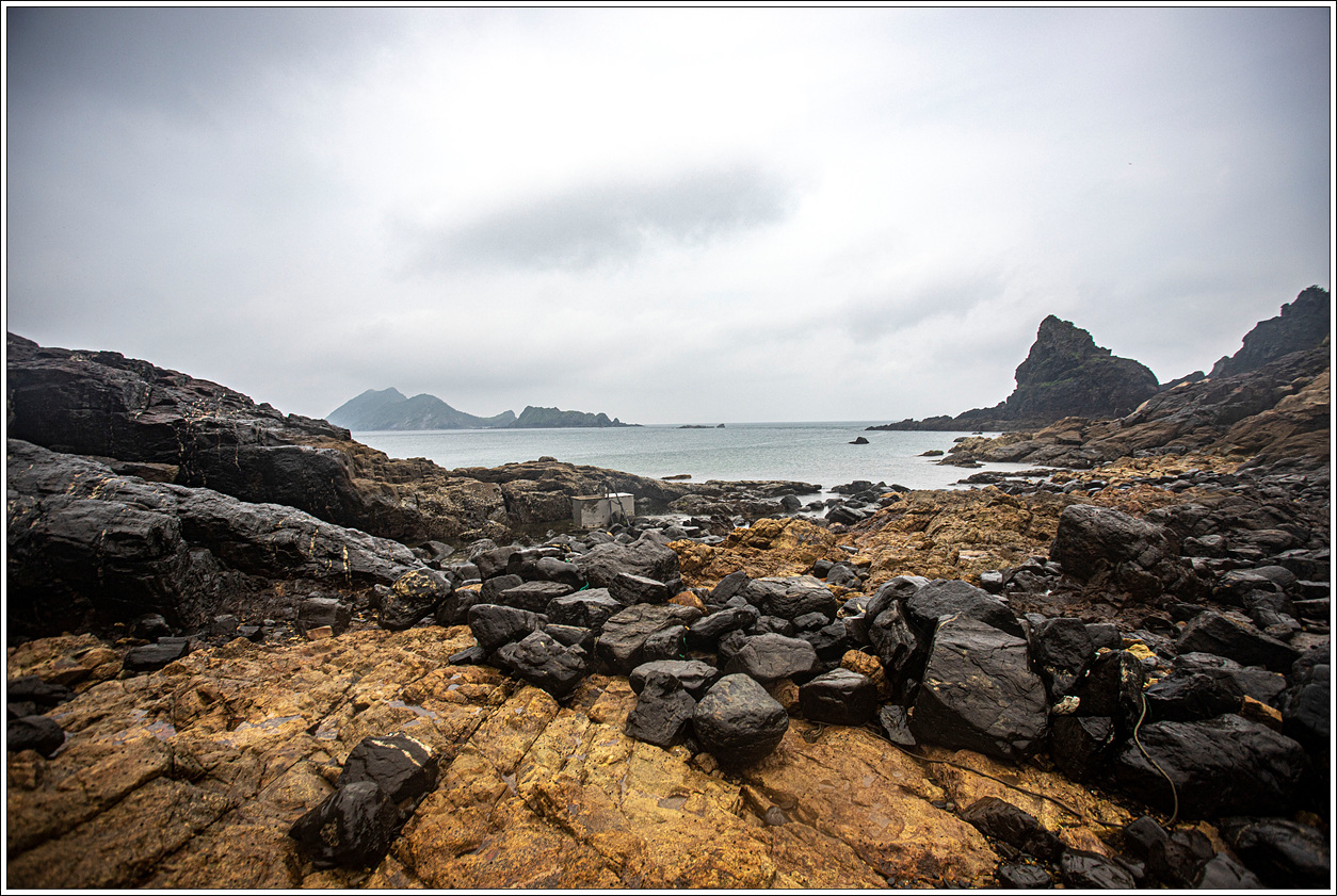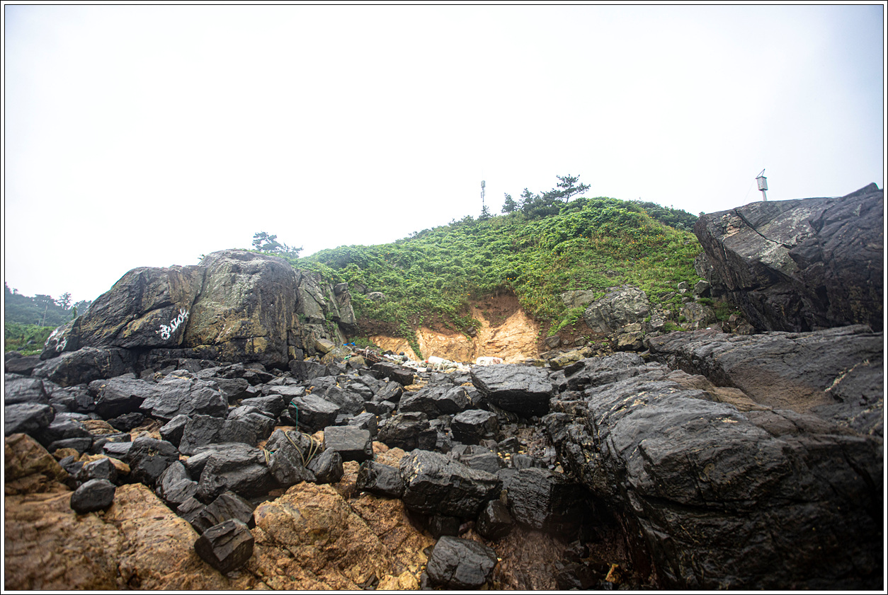 ▽ 누적금 해변의 풍경...멀리 대청도, 중청도가 보이고 해변의 돌들은 날씨 탓인지, 빗물을 머금어서인지 시커멓게 보여서 마치 탄광촌에 와 있는 느낌이다.