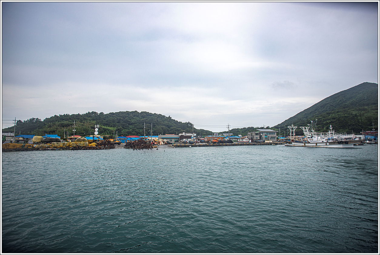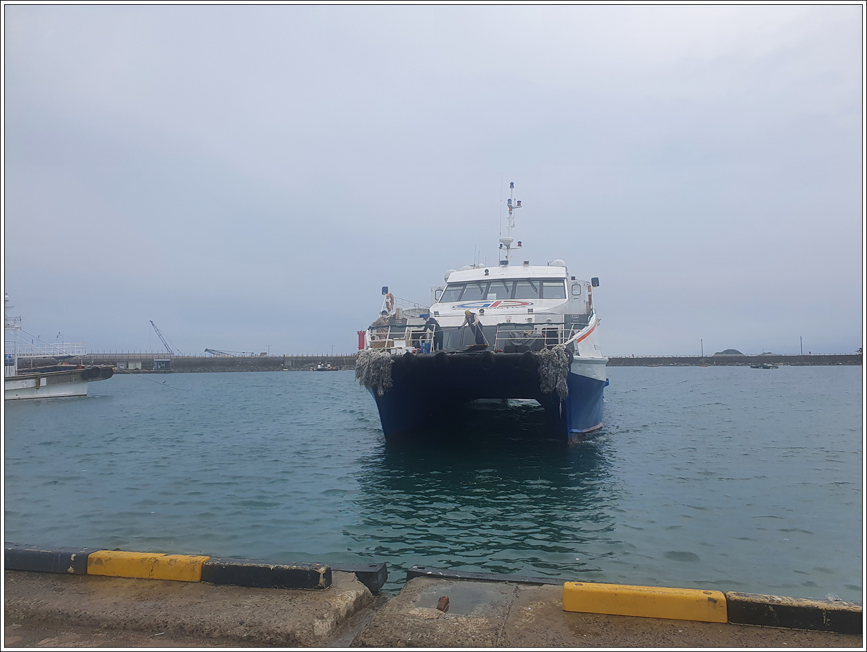 ▽ 오전에 타고 왔던 고속훼리호가 도착했다. 우중의 날씨지만 바람이 그렇게 심하게 불지 않아 혹시 배가 뜨지 않을까 염려했었는데 괜한 염려였다. 오전에는 썰물로 하선할 때 금방 내렸는데 오후엔 만조가 되어 뱃머리 높이만큼 사다리로 오르내려야 하니 그런 불편은 처음 겪는 것 같다.