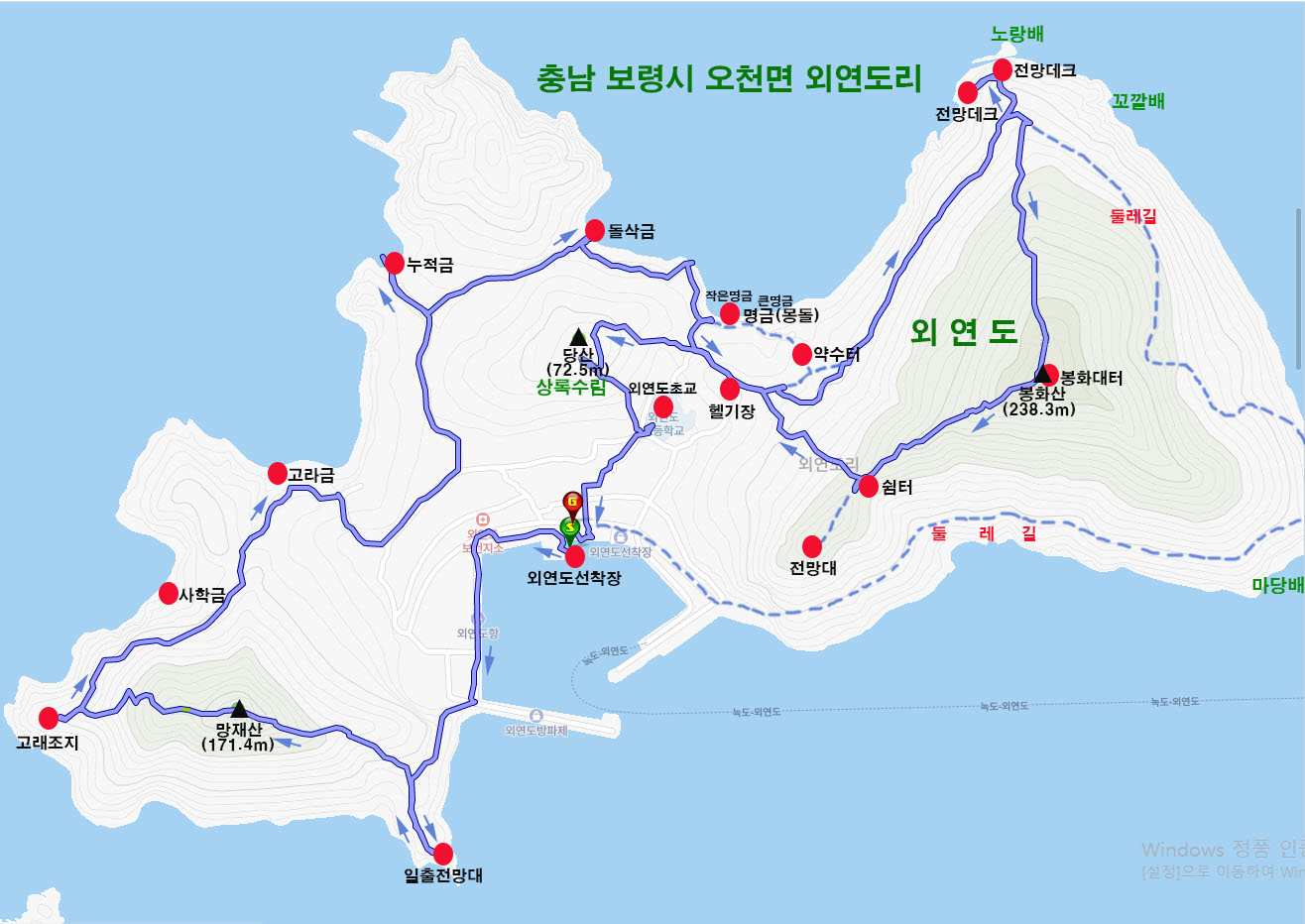 ♣ 코스:외연도선착장-일출전망대-망재산-고래조지-고라금-누적금-돌삭금-명금-헬기장-전망데크-봉화산-쉼터-당산-여객선터미널
