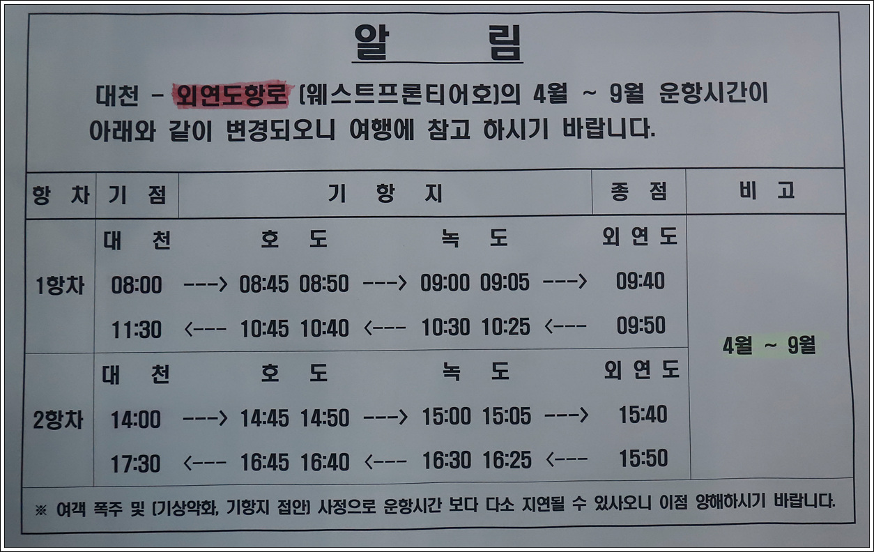 ▽ 배시간을 살펴보니 외연도 가는 배는 오전 오후 두번이란 것을 알 수가 있다. 만일 기상이변으로 8시 배가 못 뜬다면 산행을 할 수가 없으니 그런 일이 없기만을 바랄 뿐이다.