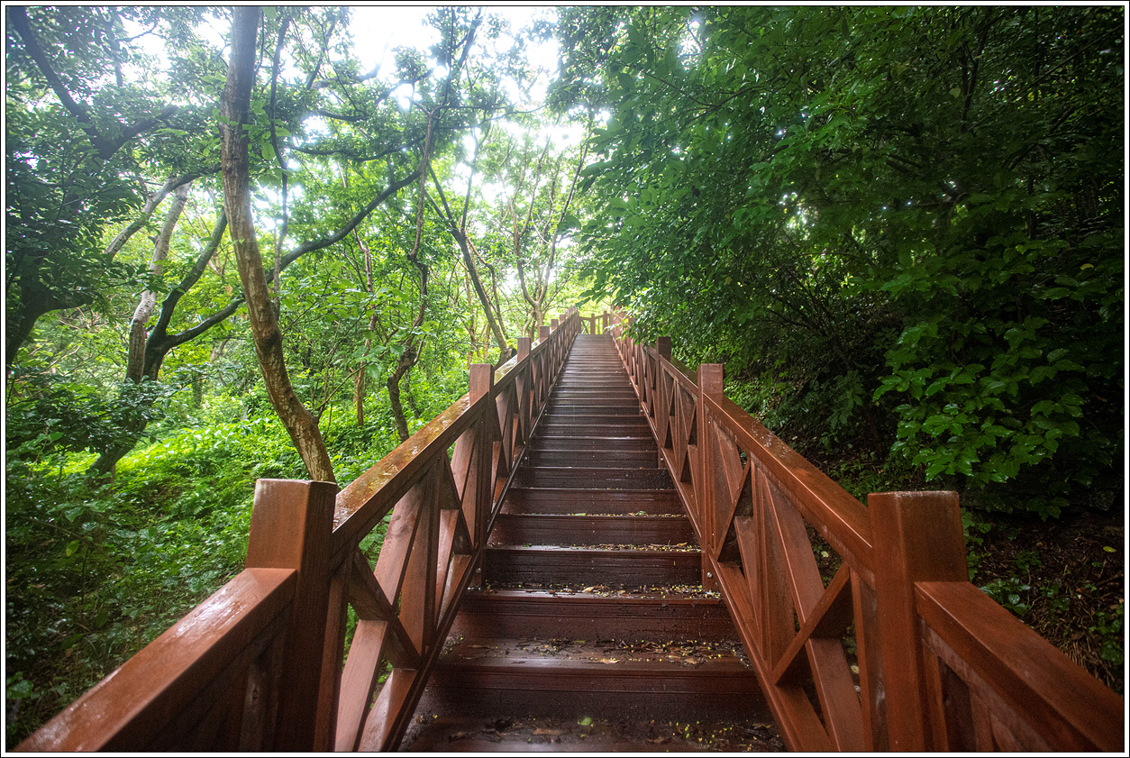 ▽ 이와 같은 데크 계단은 당산 정상 부근 전횡사당을 지나 산 넘어까지 이어지게 된다. 주변이 상록수림이라 어떤 무더위도 식혀 줄 것만 같다.