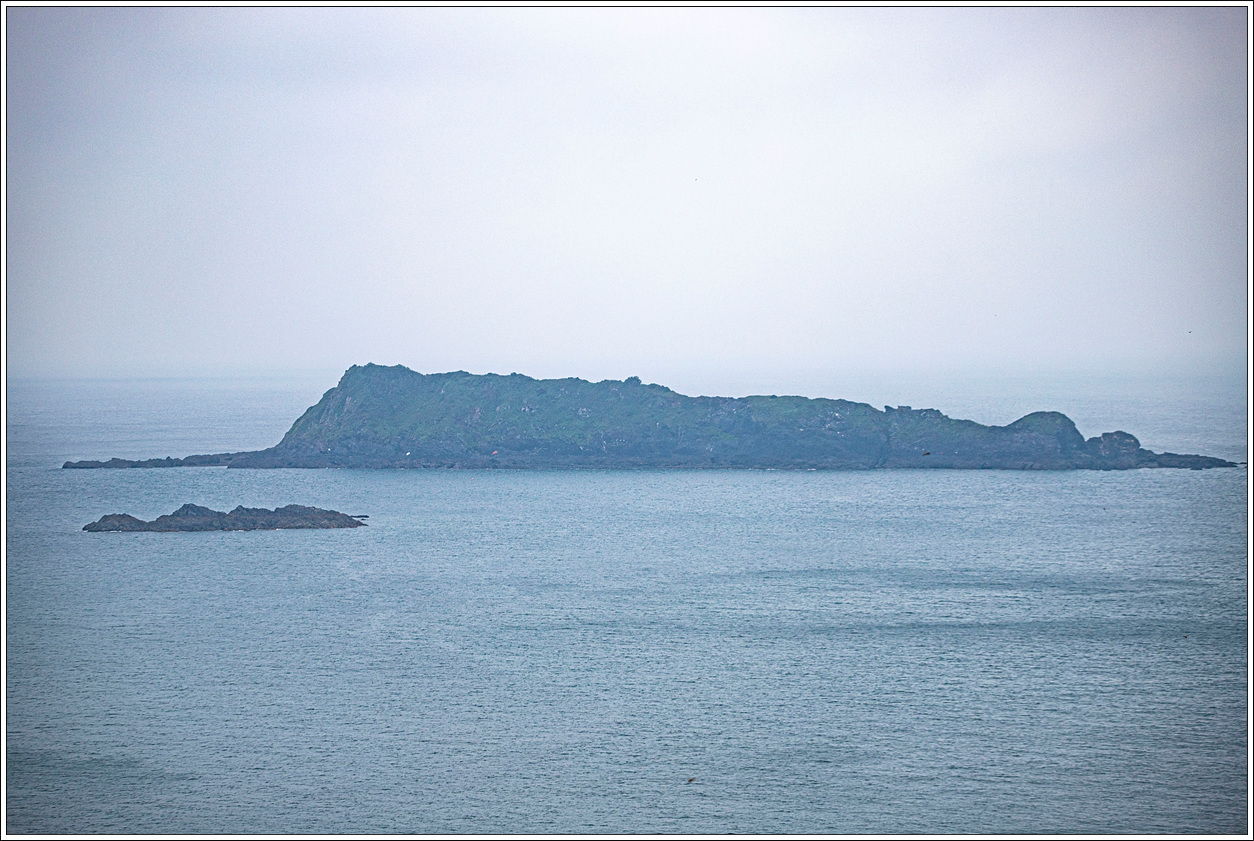 ▽ 다행히 비가 주춤하면서 안개도 걷혀 주변 조망이 가능하다. 먹구름이 잔뜩 낀 가운데 망재산과 외연도리 마을이 살짝 보인다.