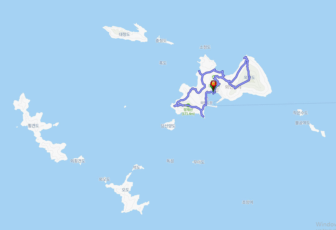 daum지도와 naver 지도상에 표기된 외연도 주변 섬 이름에 다소 차이가 있다. GPS로 표기된 지도는 naver인데 설명에서는 daum 지도를 일부 참고로 했다.