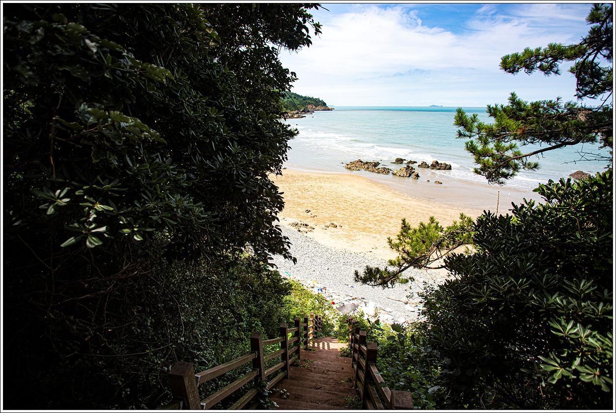 ▽ 가파를 계단 숲사이로 보이는 작은갈마골해수욕장