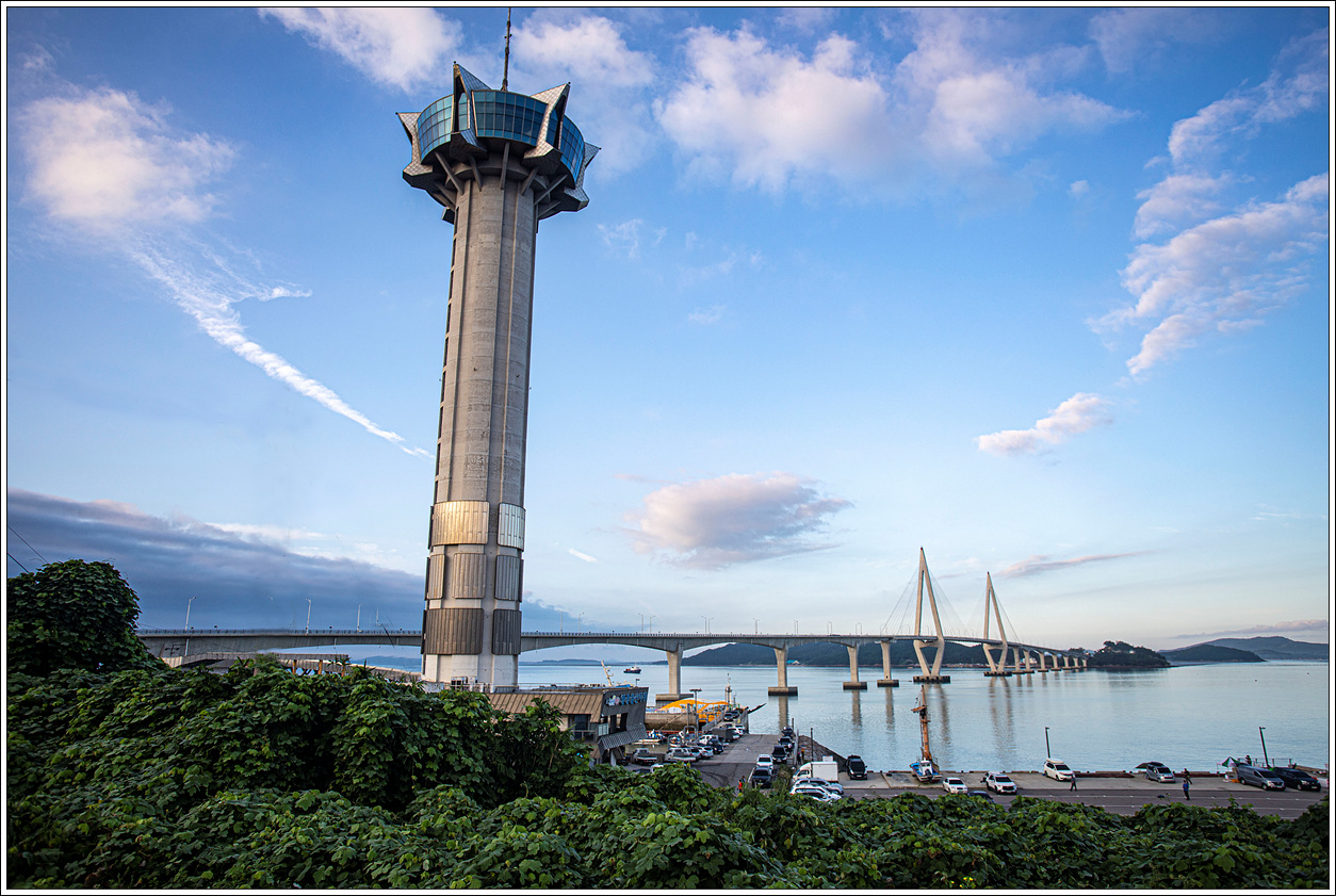▽ 지난번 송이도를 탐방하면서 들렀던 향화도항에 다시 왔다. 이곳의 소재지는 영광군 염산면 옥실리이다. 배 출항전까지 시간이 많이 남아 옥실리 마을을 돌아보며 칠산대교 및 칠산타워를 담아봤다. 전남에서 가장 높은 111m의 전망대로 영광군 11개 읍면이 하나로 화합한다는 의미를 가지고 있다고 하며 굴비의 비늘과 파도, 바람, 태양을 형상화한 타워이다.