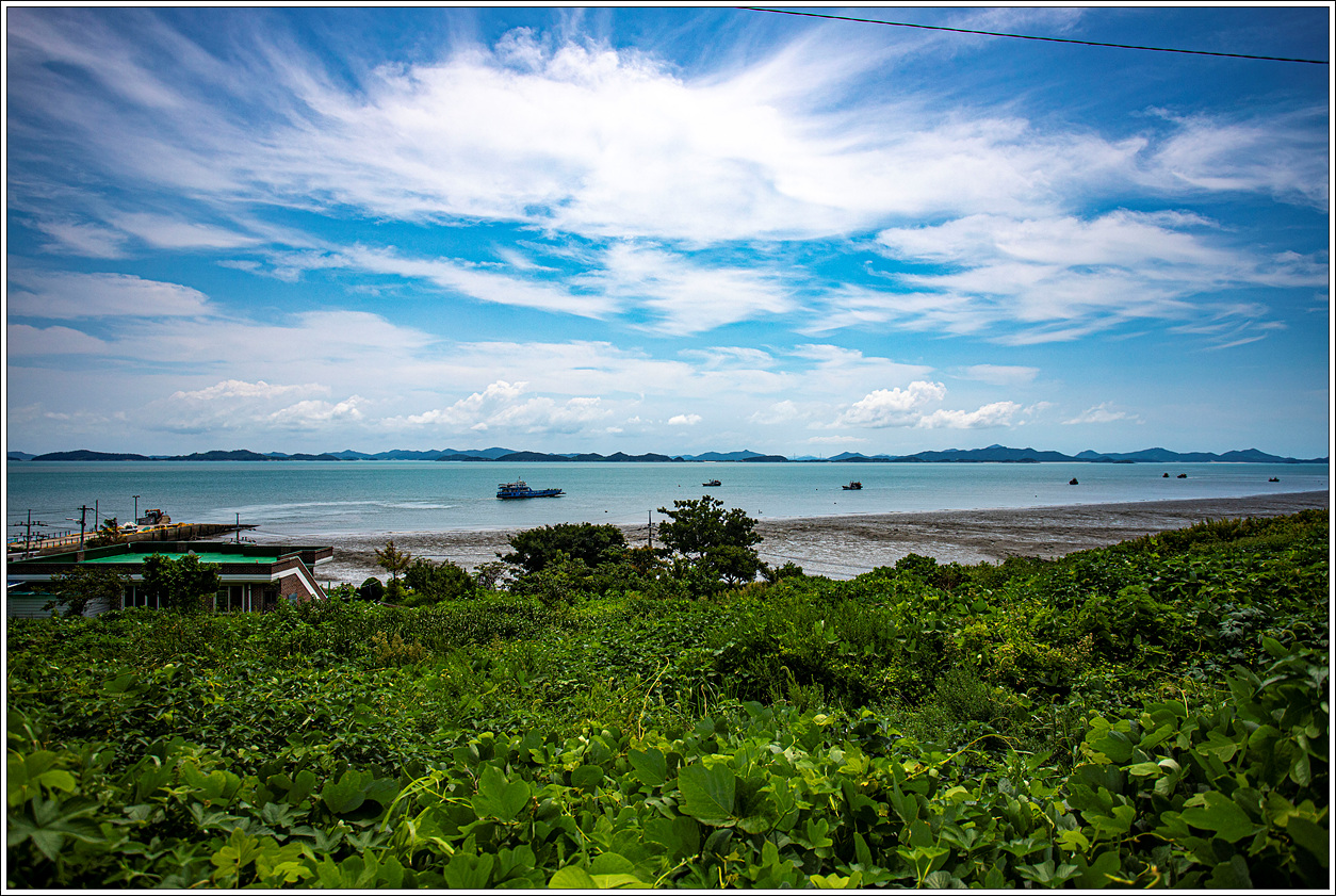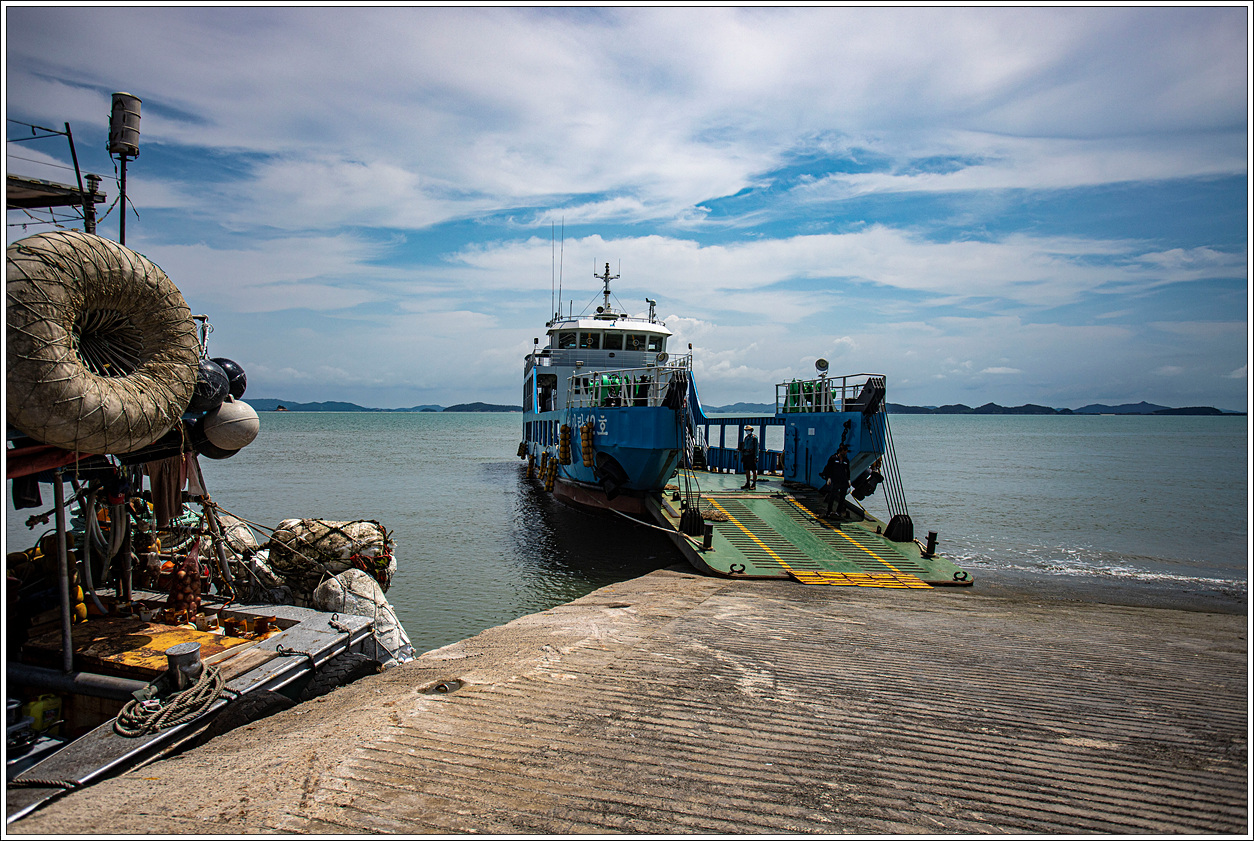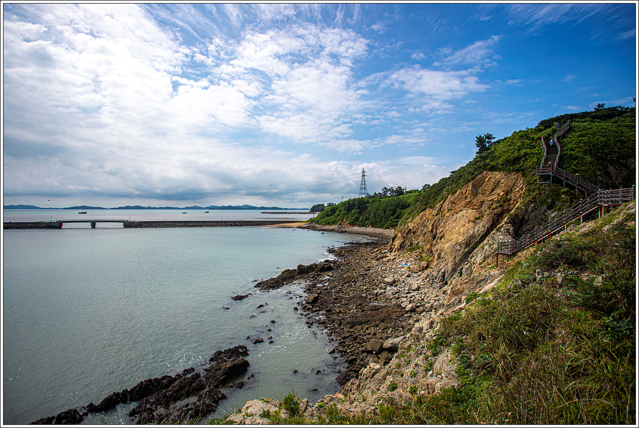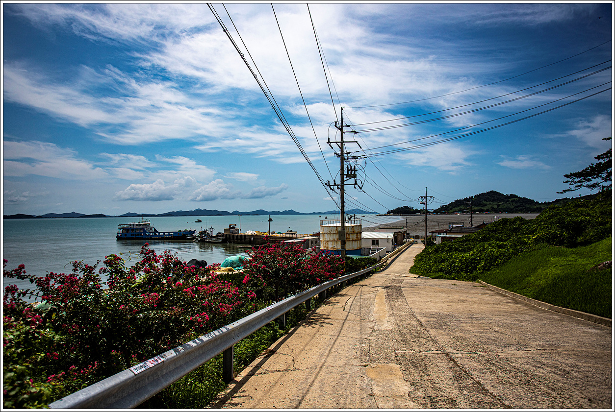 ▽ 상낙월도에 먼저 기착하게 된다. 이곳에서 하선하여 오른쪽으로 트레킹을 해도 되지만 왼쪽 마을을 지나 하낙월도를 시계방향으로 돌고 역시 상낙월도를 돌아 원점회귀해도 되지만 조금은 여유로운 트레킹을 하고자 하낙월도에서 하선하도록 한다. 파란 하늘에 구름이 각양각색의 모양으로 연출되어 풍경을 더욱 돋보이게 한다.