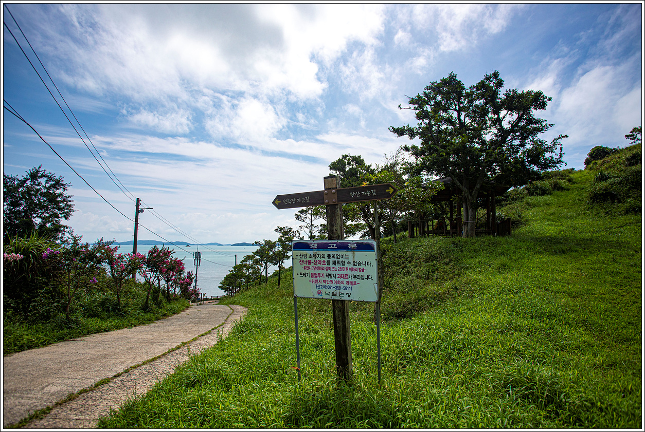 ▽ 첫 전망대에 올라섰다. 바람도 없고 다소 무더운 날씨다. 등로의 정비가 되지 않아 이슬에 젖은 풀숲을 걷게 되는데 낙월면 전체의 섬들을 관리하는 지자체의 예산도 만만치 않을 것으로 보인다.