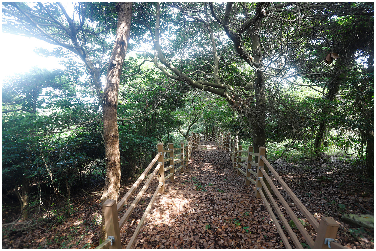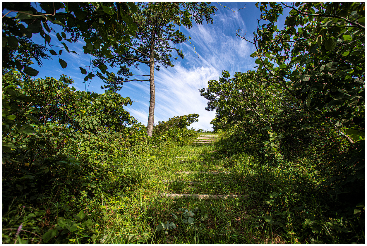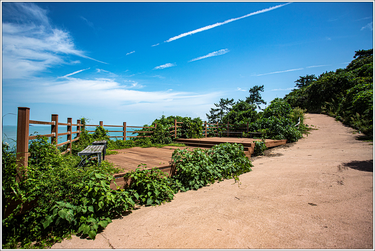 ▽ 사람들의 발길이 끊겨서인지 나뭇잎으로 뒤덮혀 있는 데크계단을 내려가다 보면 시원한 그늘과 바닷바람을 맞는 기분이 좋다.