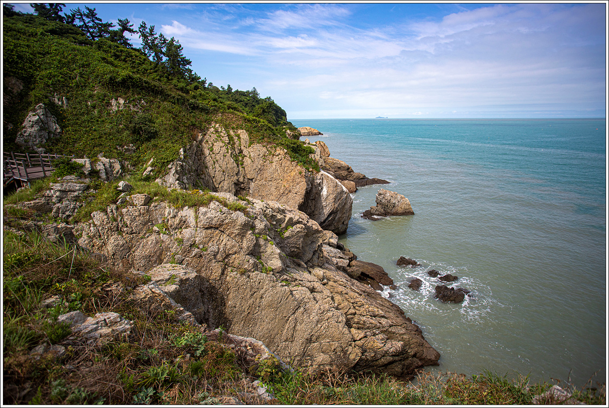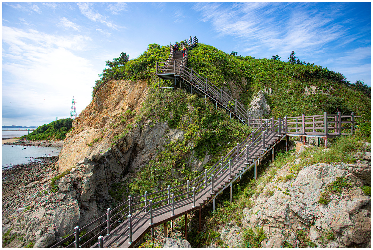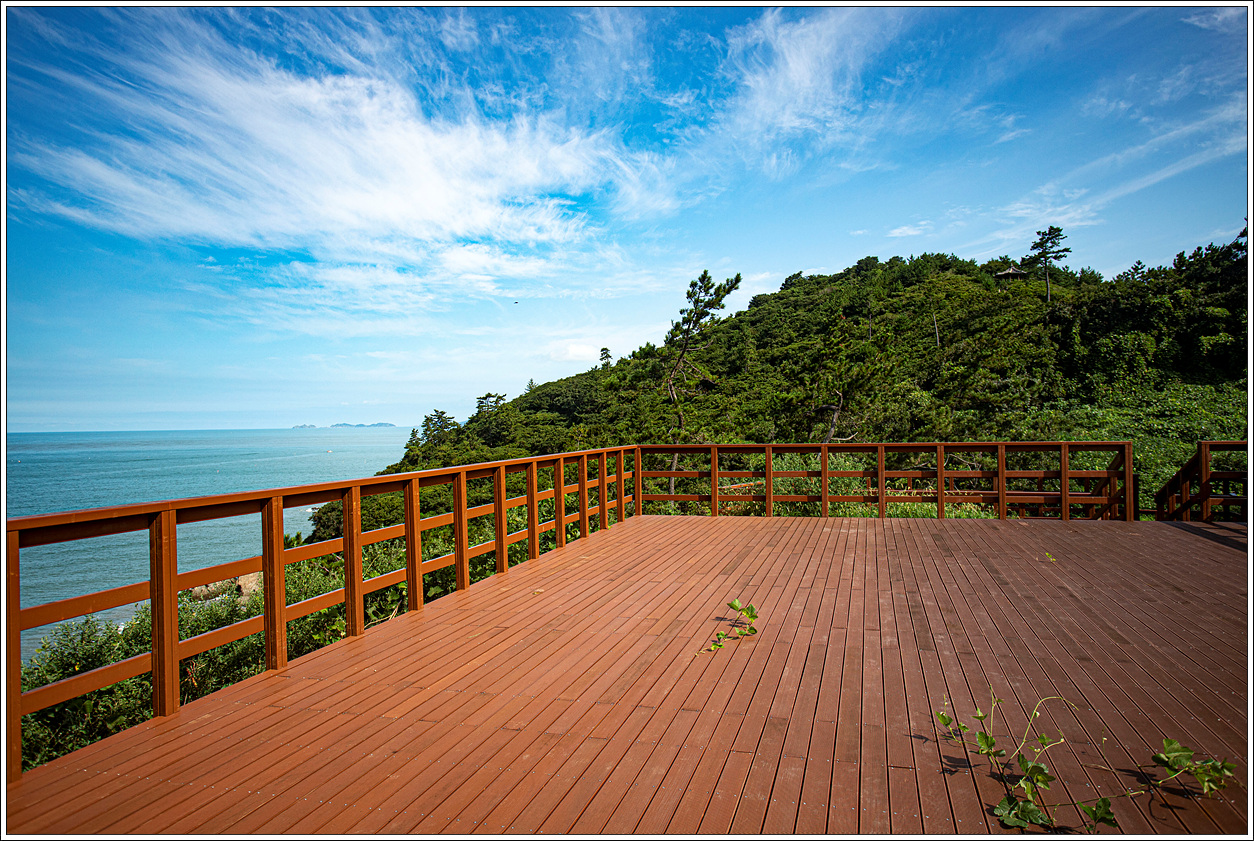 ▽ 사람들의 발길이 끊겨서인지 나뭇잎으로 뒤덮혀 있는 데크계단을 내려가다 보면 시원한 그늘과 바닷바람을 맞는 기분이 좋다.