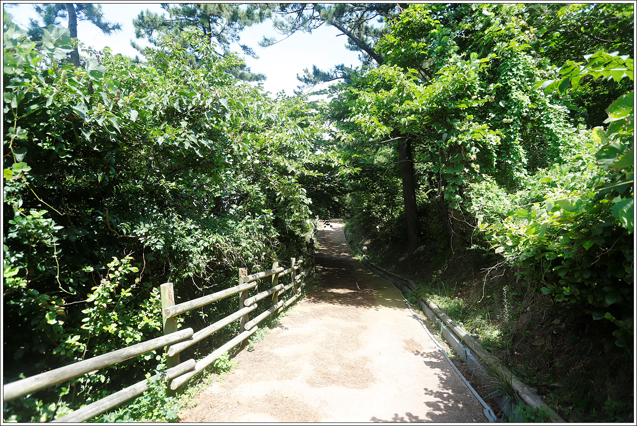 ▽ 삼복더위에 피는 배롱나무가 만개한 시멘트 포장도로인 둘레길을 따라 해수욕장 방향으로 진행한다. 이러한 포장도로는 윗머리산을 돌아 선착장까지 이어지니 나무 그늘이 없어 양산을 준비해 가는 것도 뜨거운 햇살을 피하는 방법 중 하나다.