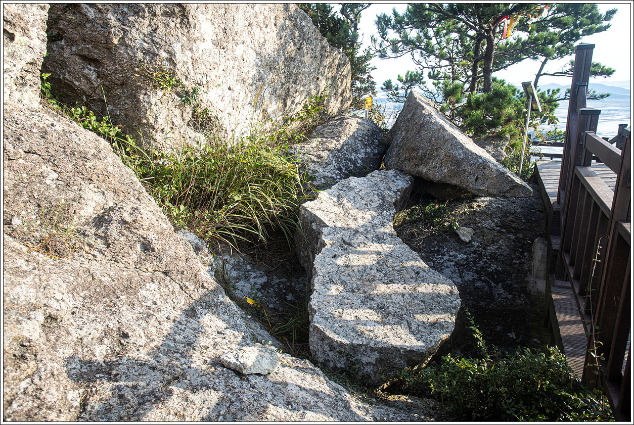 ▽ 5년전에는 등로이기도 한 이 한반도 지도바위위로 밟고 지났는데 지금은 데크계단이 설치되어 있어서 살짝 우회를 하게 된다. 누군가가 돌멩이를 따로 놓아 제주도 표시를 해 놨다.