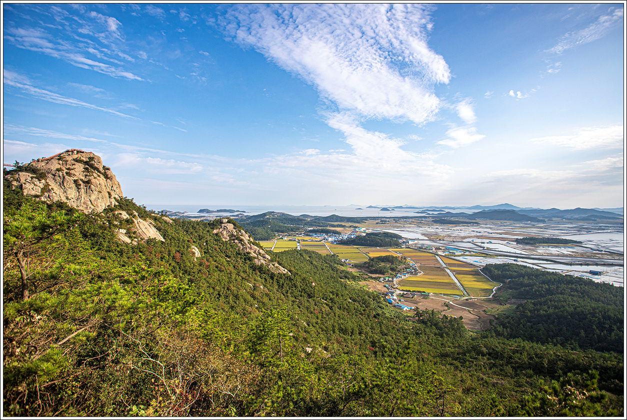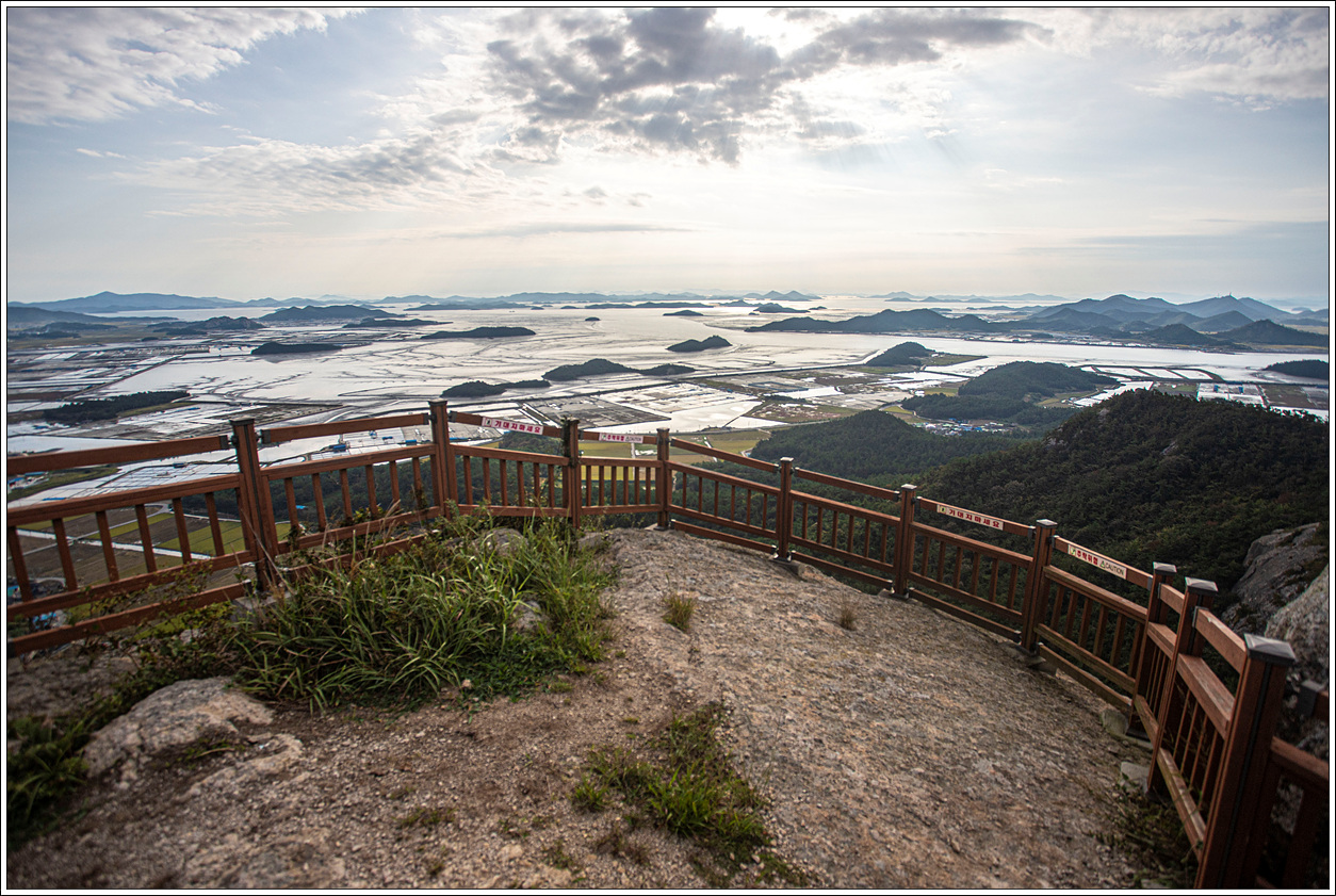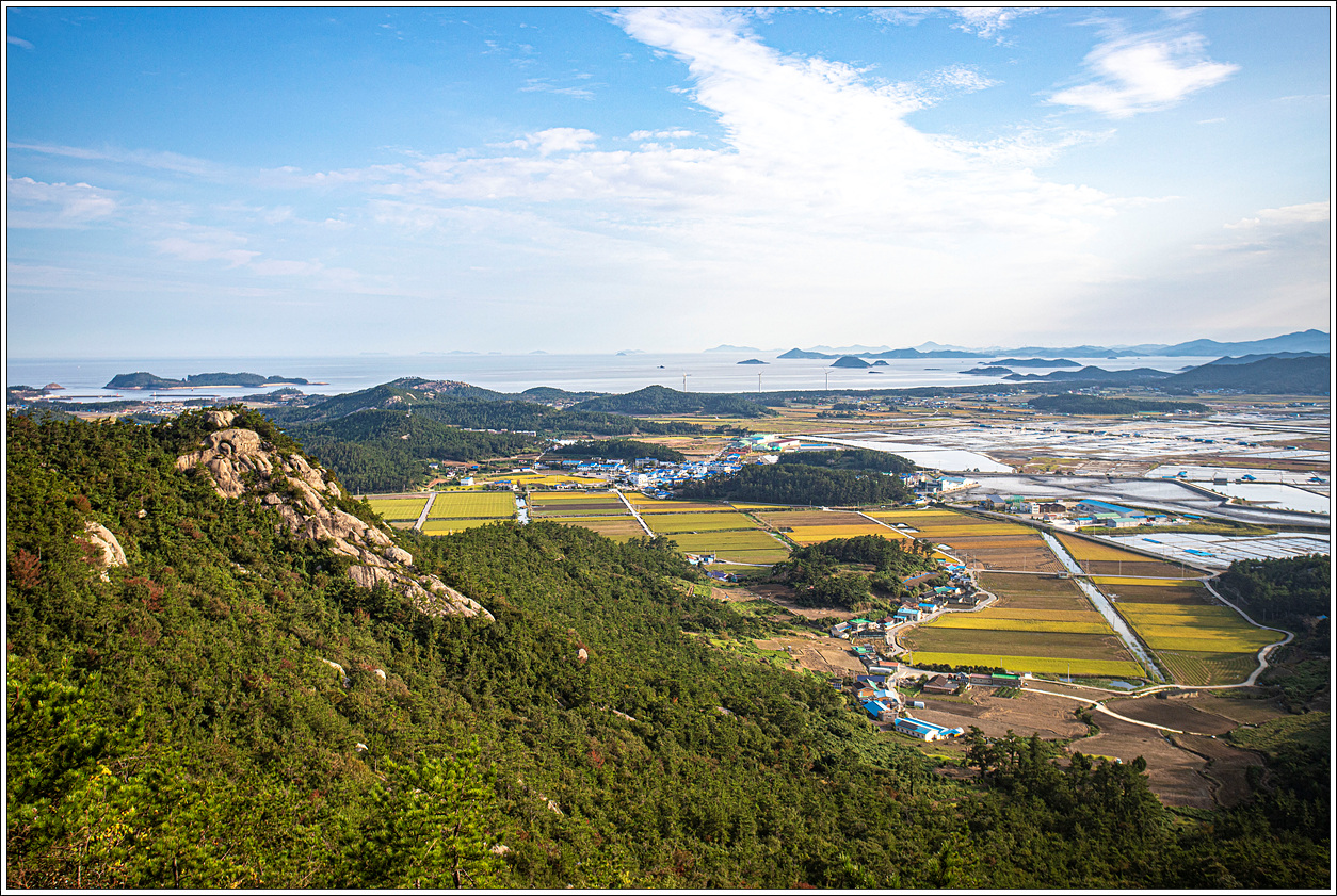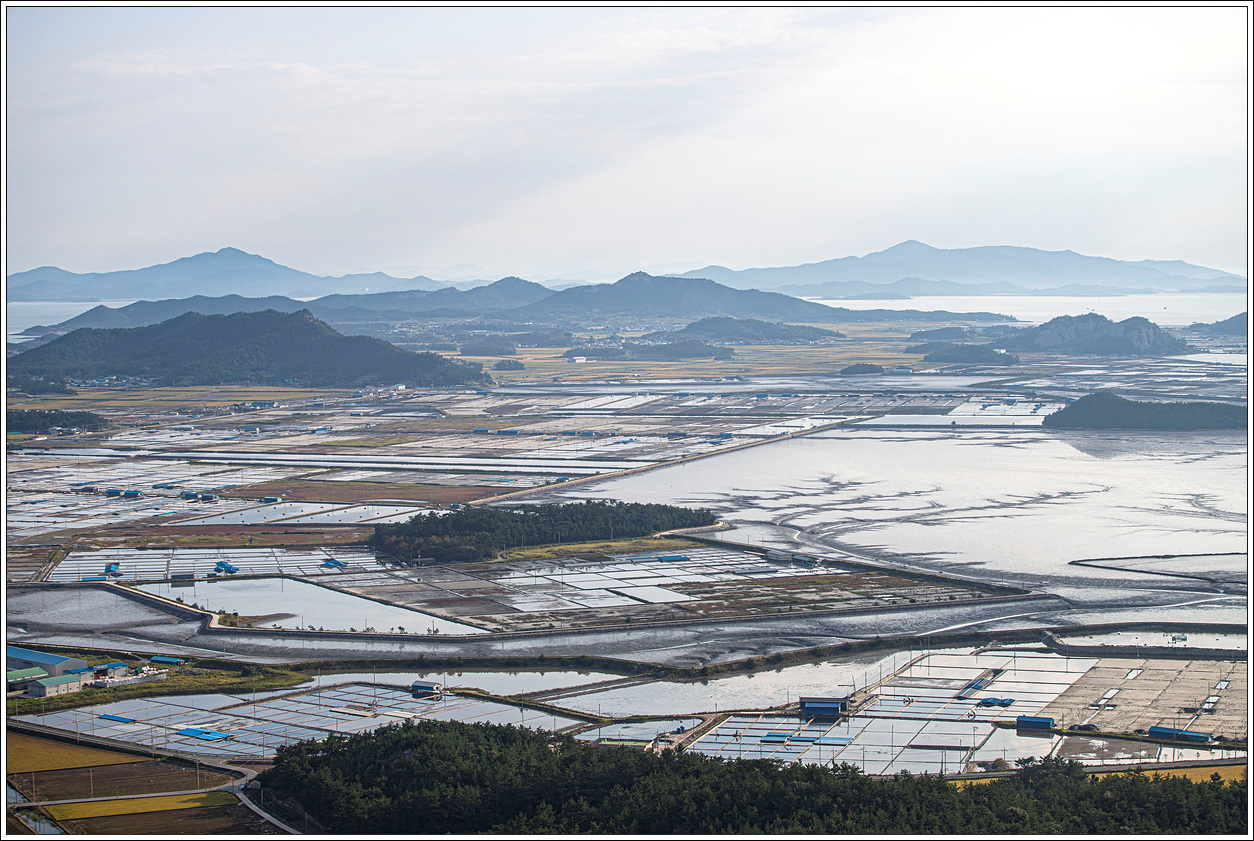 ▽ 정상에서 다시 조망해 보는 동쪽편의 풍경으로 염전이 마치 5월에 모내기를 위해 논에 물을 대 놓은 듯한 모습이다.