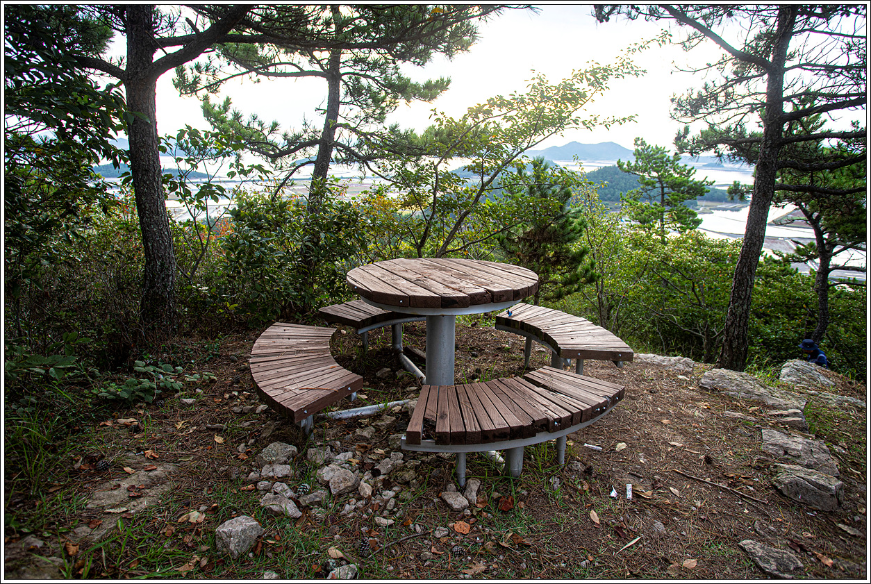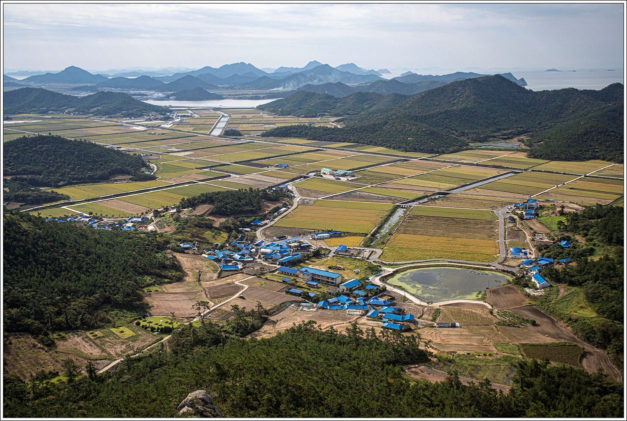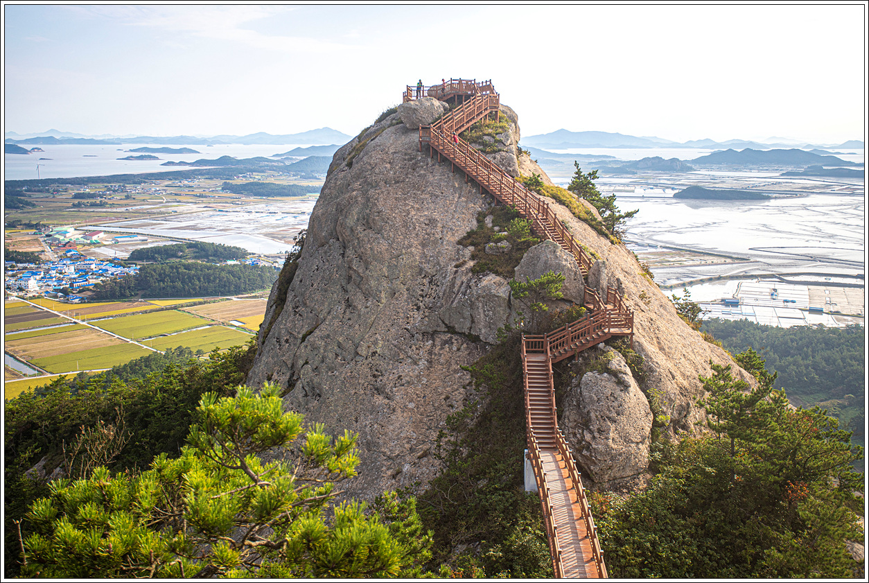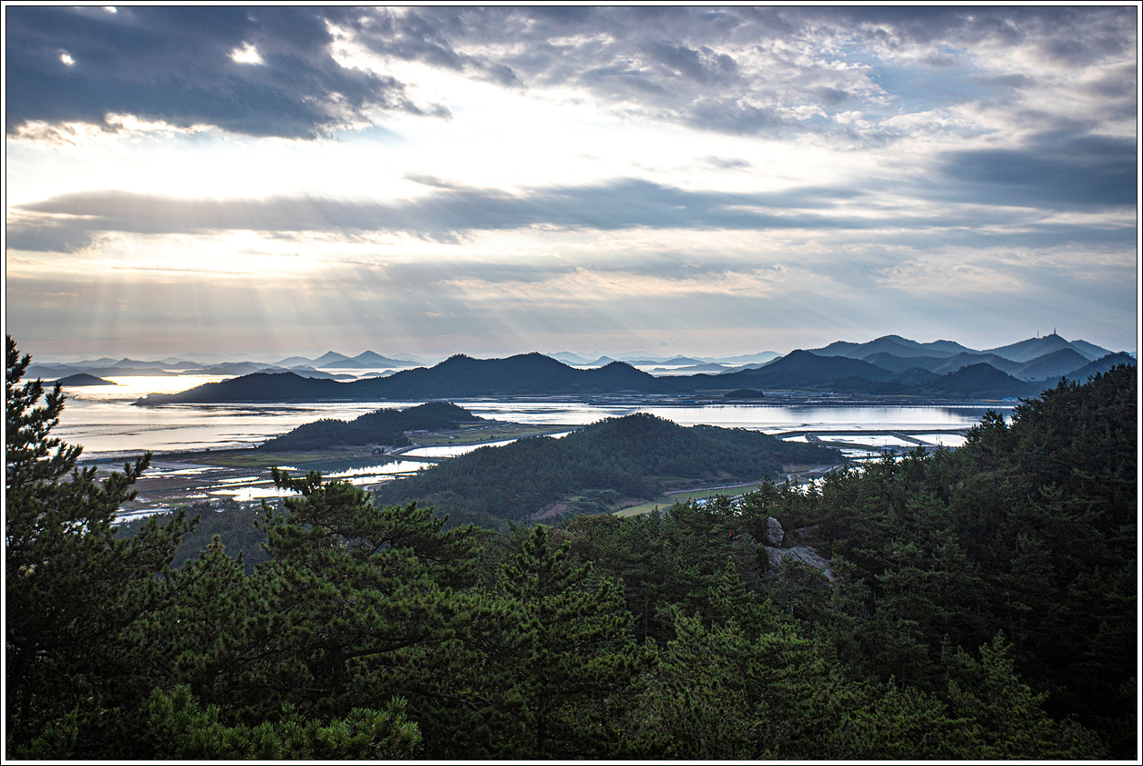 ▽ 정상에서 다시 조망해 보는 동쪽편의 풍경으로 염전이 마치 5월에 모내기를 위해 논에 물을 대 놓은 듯한 모습이다.