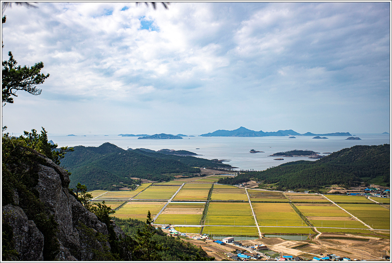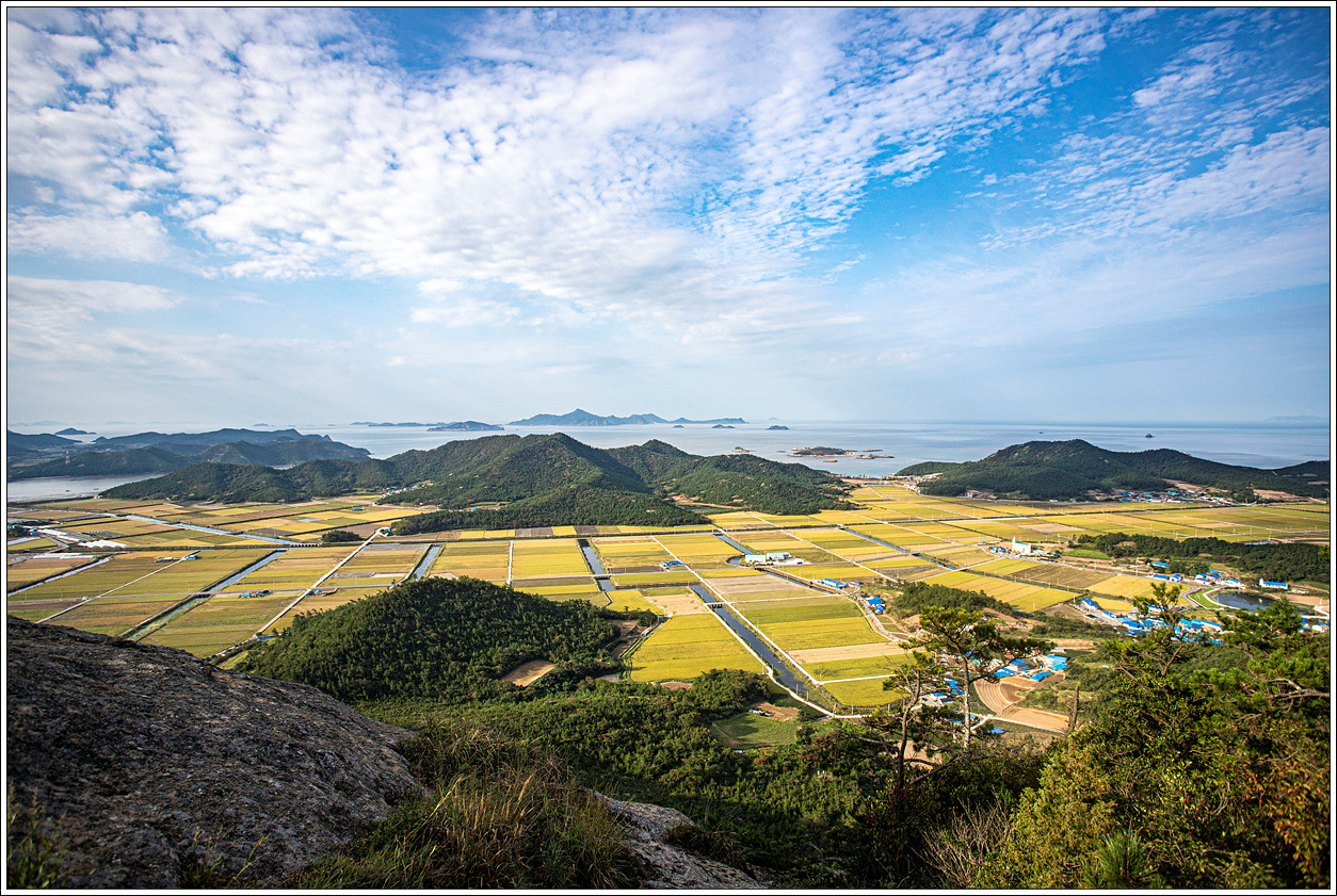 ▽ 죽치마을 앞 황금들녘과 안산(128.5m) 넘어 멀리 오늘 오후에 올라 볼 우이도의 상산봉(361m)이 뾰족 올라와 있다.