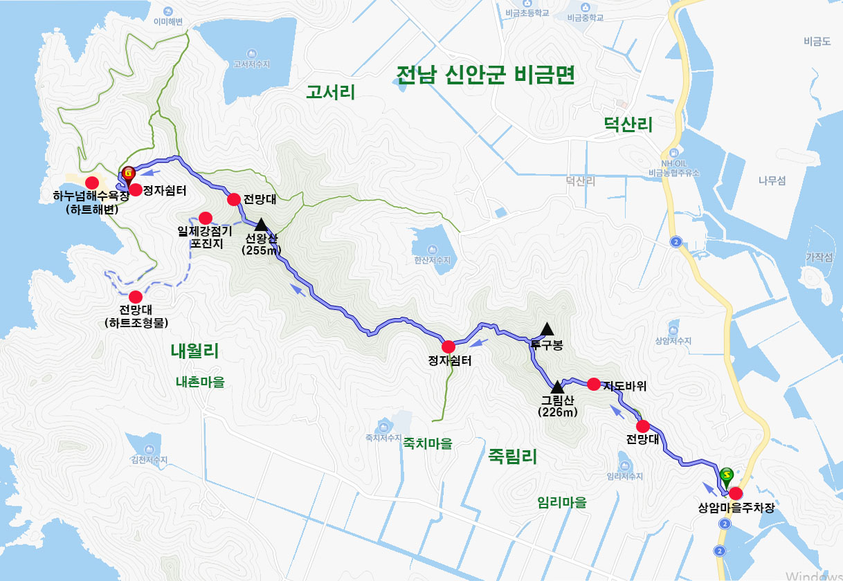 ♣ 소재지: 들머리-전남 신안군 비금면 죽림리(상암마을주차장), 날머리- 신안군 비금면 내월리 (하누넘해수욕장)