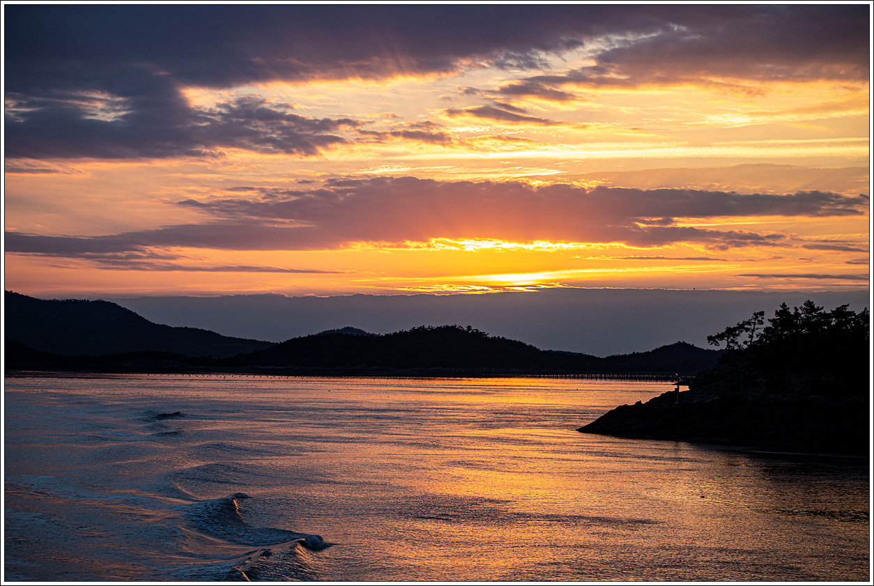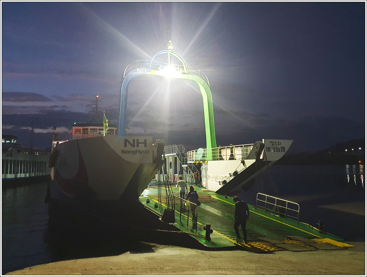 ▽ 새벽에 암태도 남강항에 도착, 식당이 없으므로 포장마차에서 간단히 아침 식사를 한 후 날이 밝아 오면서 비금도의 가산항으로 가기 위해 차도선에 몸을 싣는다.