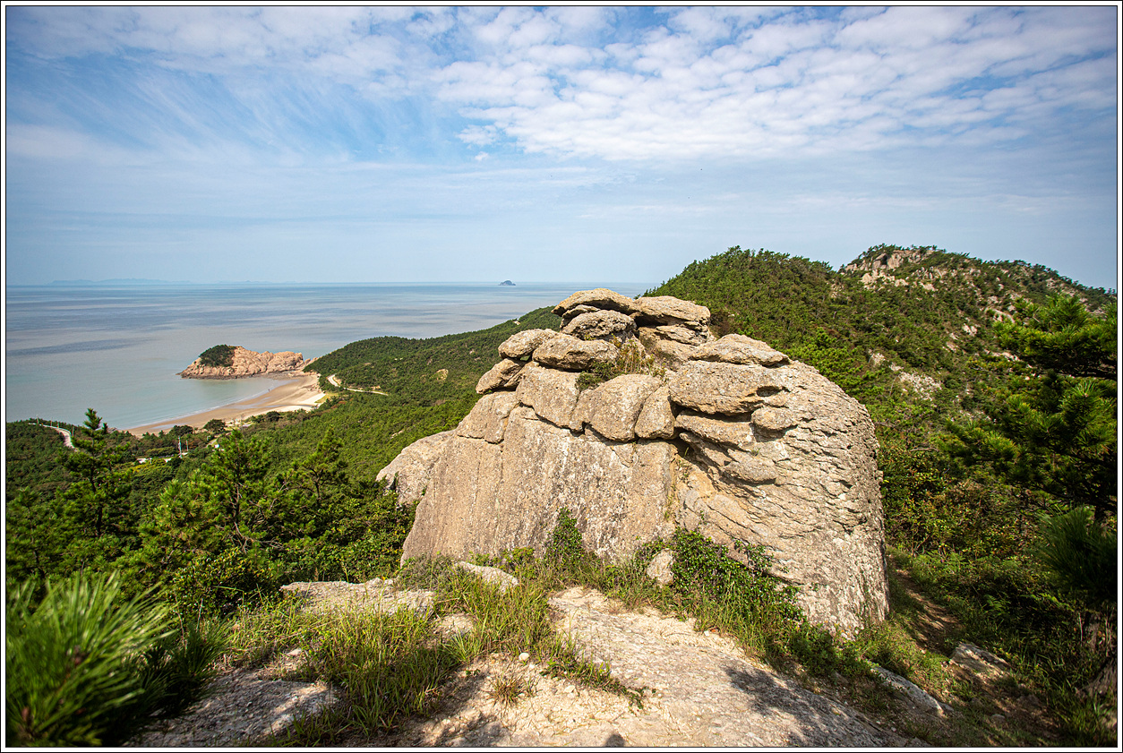 ▽ 투구봉의 오른쪽으로 조망되는 풍경으로 비금면 사무소 소재지인 덕산리와 명사십리해수욕장이 보인다.