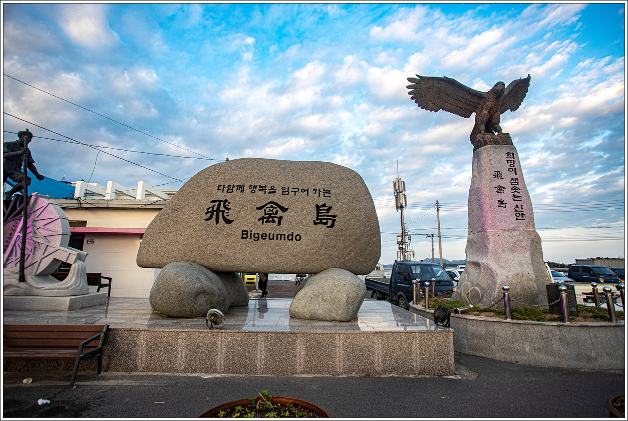 ▽ 여객터미널 옆에 세워진 비금도 표지석...왼쪽에는 소금을 생산하기 위해 바닷물을 염전에 퍼 올리는 수리차가 어릴적 시골에서 논에 물을 댈때 돌렸었던 농기구 중의 하나인데 이곳에서 보니 정겹다.