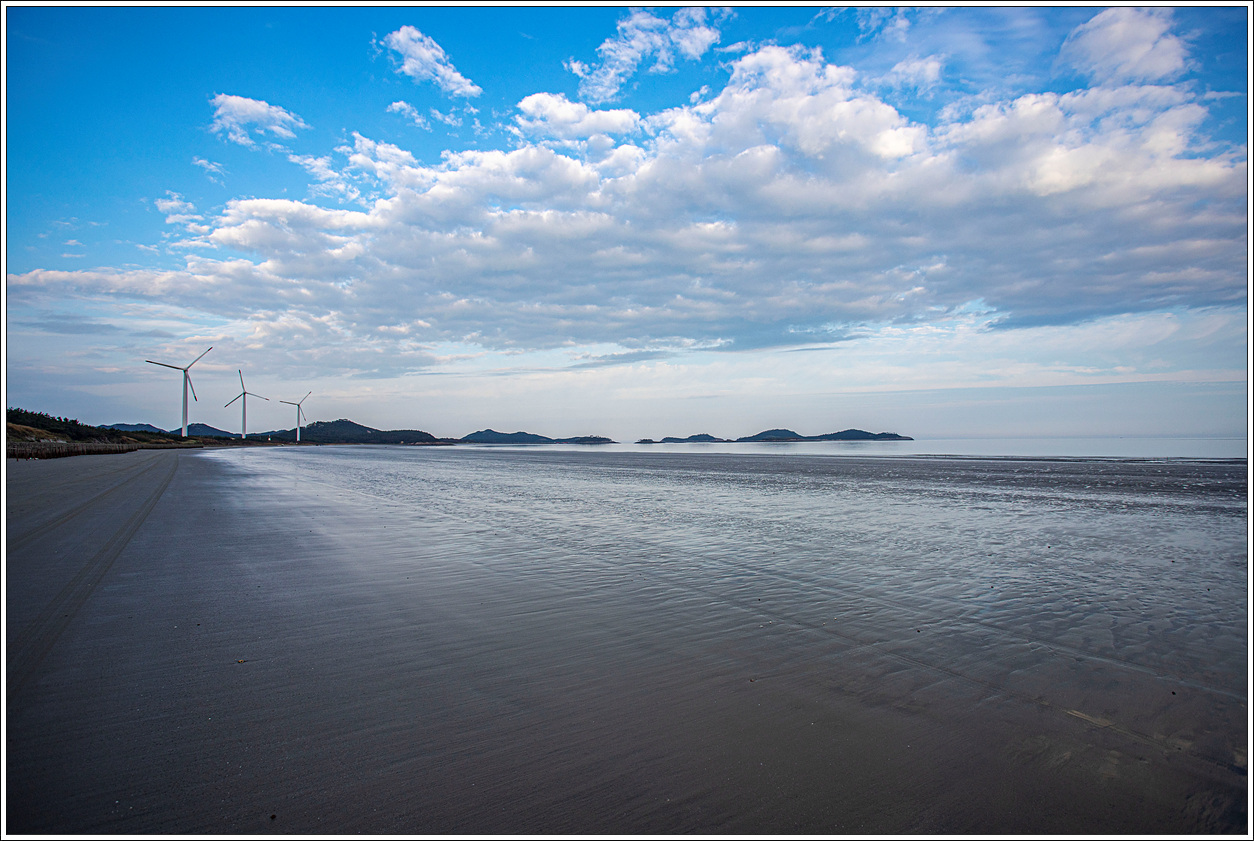 ▽ 명사십리해수욕장으로 접어 드는 해변길은 몇 개가 있는 듯 한데 중간쯤인 이곳에서 풍력발전기가 있는 서쪽편을 보니 까마득하다. 모래사장 뿐, 보이는 것은 아무것도 없어 6.25전쟁 당시 군사비행장으로도 사용했다는 백령도의 사곶해변이 생각난다.