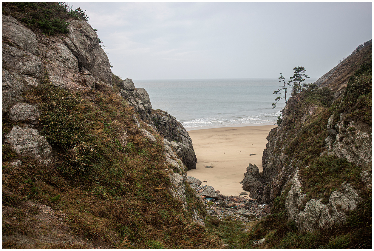 ▽ 암릉 사이로 살짝 보이는 모래사장이 보여 내려가 볼까 하다가 빗방울은 굵어지고 귀찮아서 내려서 보지 않았는데 후에 갔다 온 분들이 경관이 좋다는 얘기를 들으니 뭔가 한가지 빼 먹었다는 아쉬움이 든다.