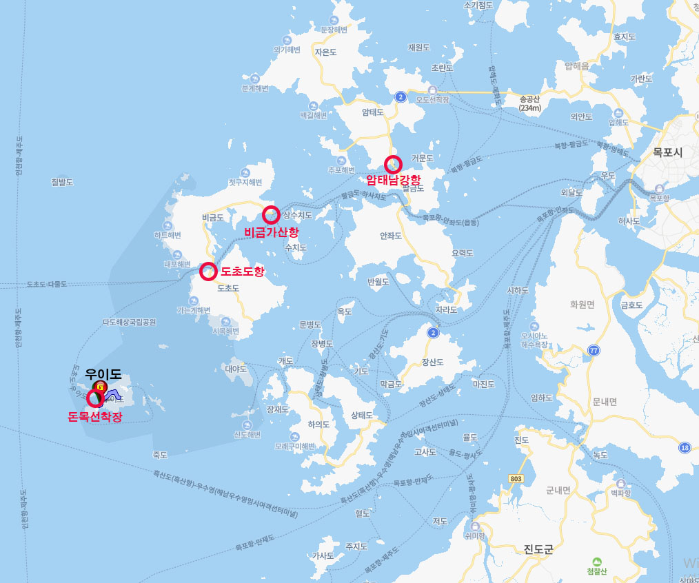 ▽ 우이도를 가려면 목포여객선터미널에서 쾌속선으로 도초도항까지 가서 차도선인 섬사랑6호로 갈아 타는 방법과 목포여객선터미널에서 섬사랑6호로 도초항을 거쳐 바로 가는 방법이 있다. 섬사랑6호인 차도선은 목포~도초항~우이도항(진리선착장)~서우이도~동우이도~우이도 돈목선착장~우이도 성촌선착장을 경유한다.