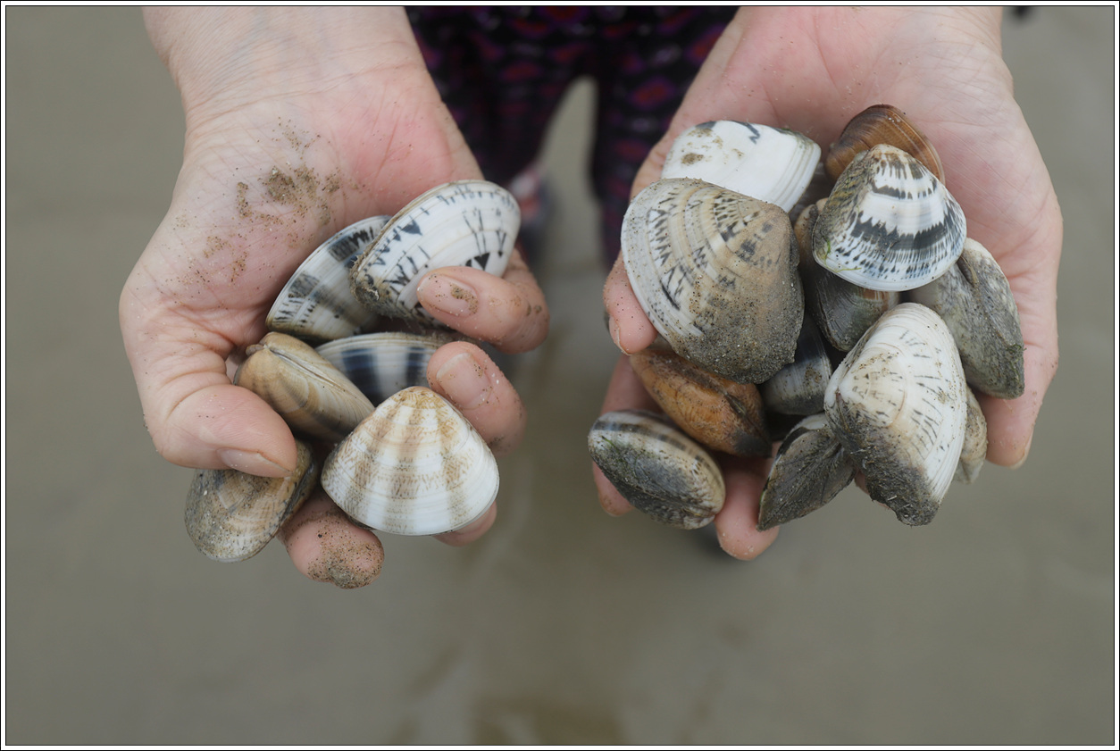 ▽ 성촌해변은 돈목해변에서와 달리 도구로 비단조개를 캐지 않고도 모래사장 위에 나와 있는 것을 그냥 줒을 수 있어 잠깐 동안 한끼 국거리 정도는 채취할 수 있다.