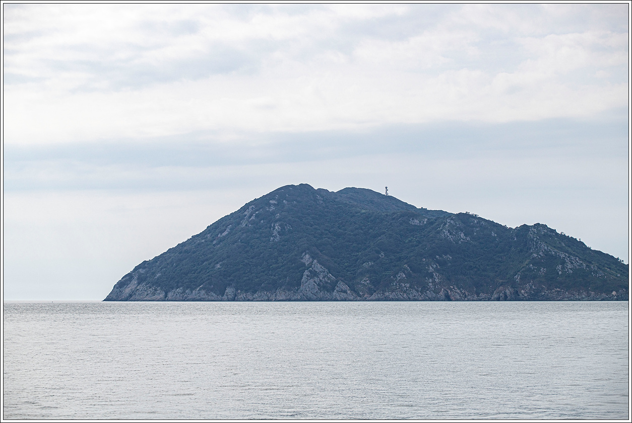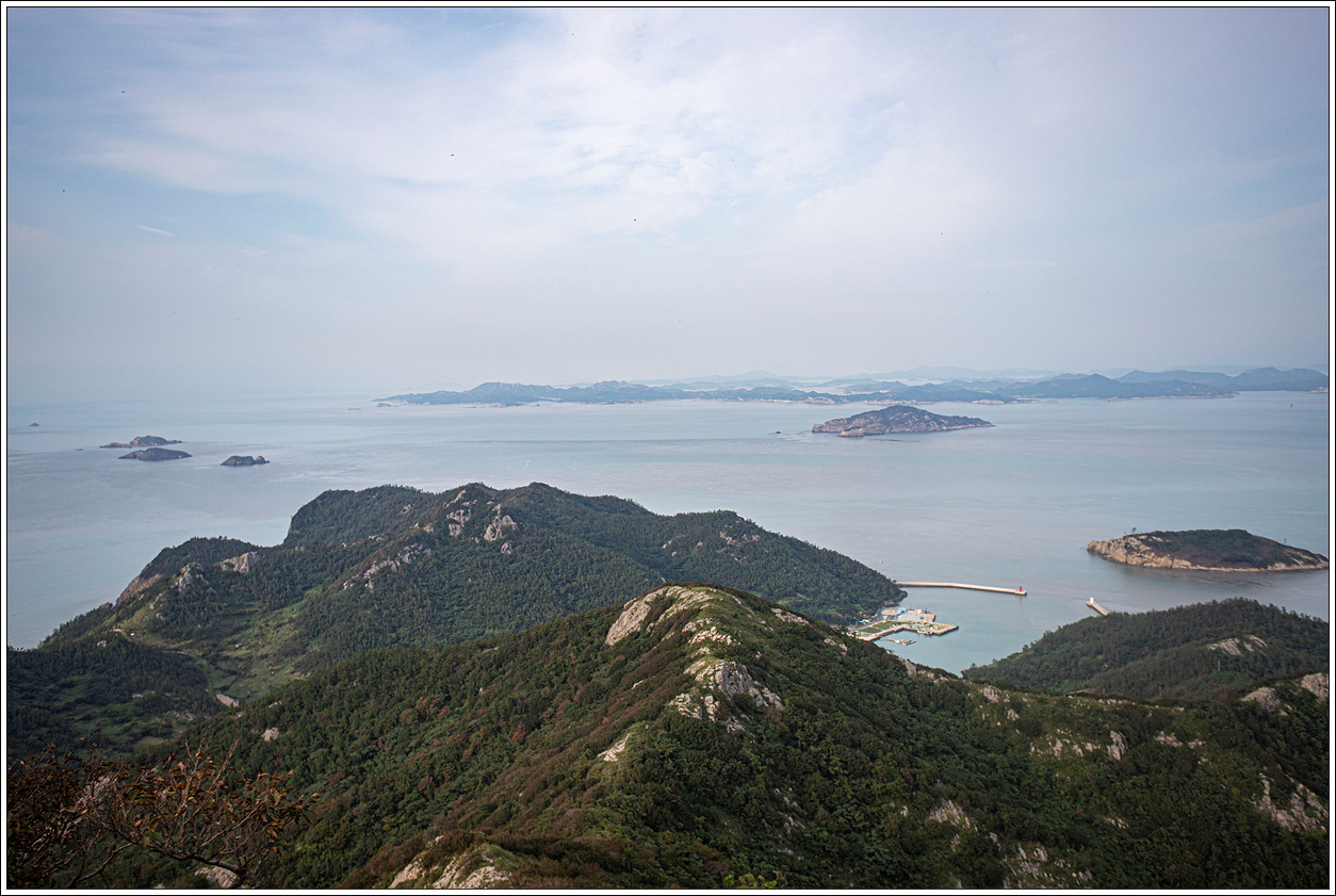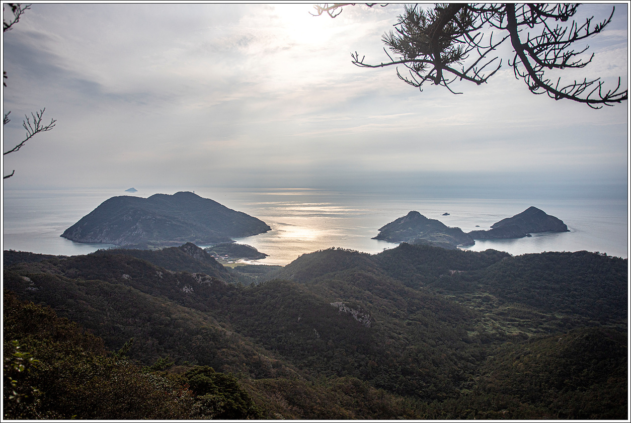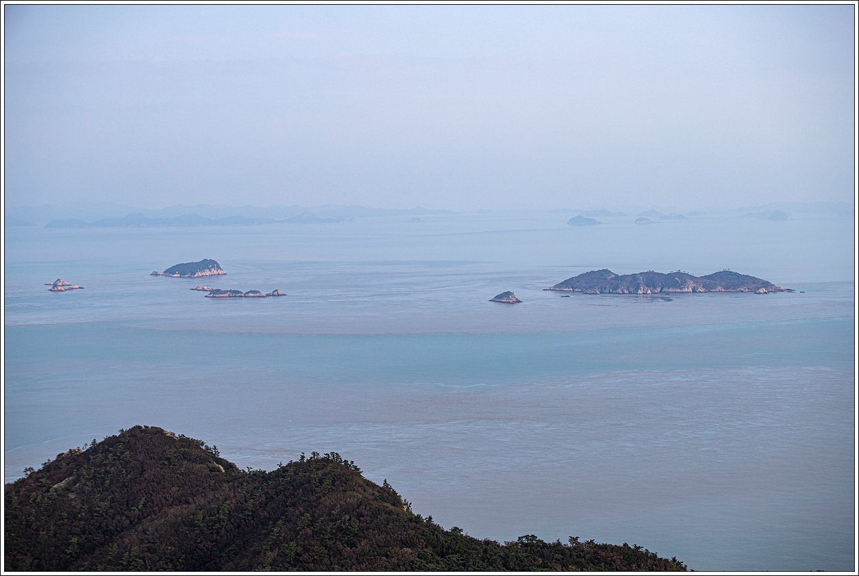 ▽ 건너편 도초도와 우이도 중간쯤에 위치한 경치도...왼쪽 멀리 자은도의 두봉산(364m)과 오른쪽 멀리 암태도의 승봉산(356m)이 희미하게 잡혔다.