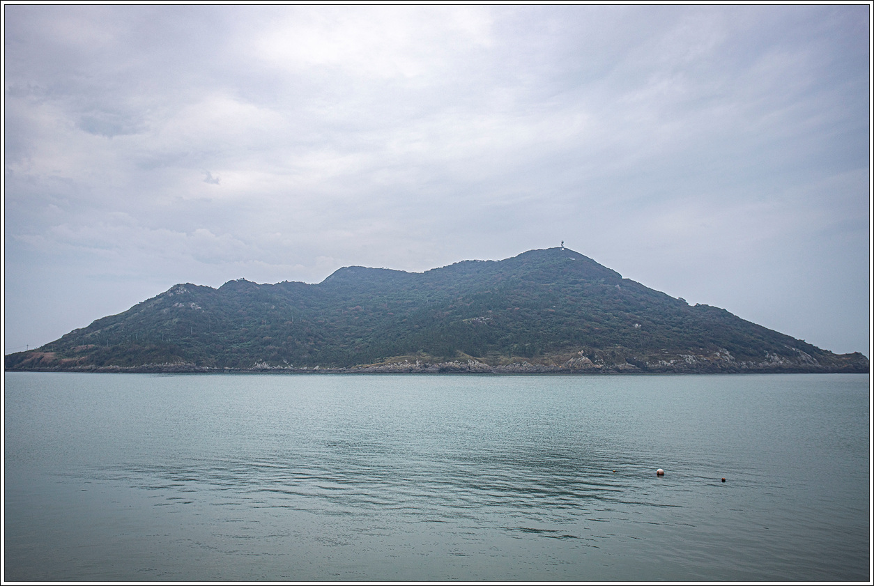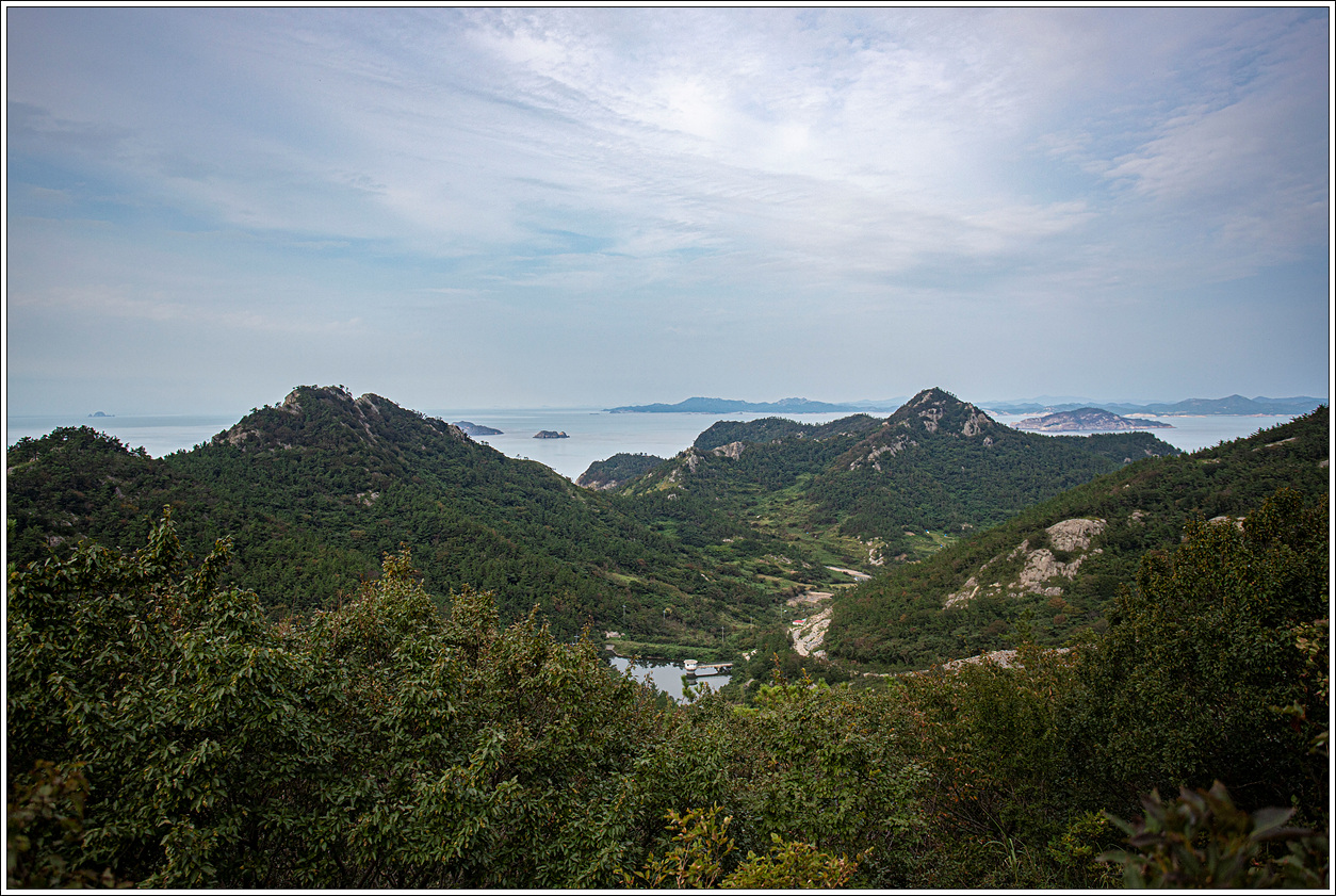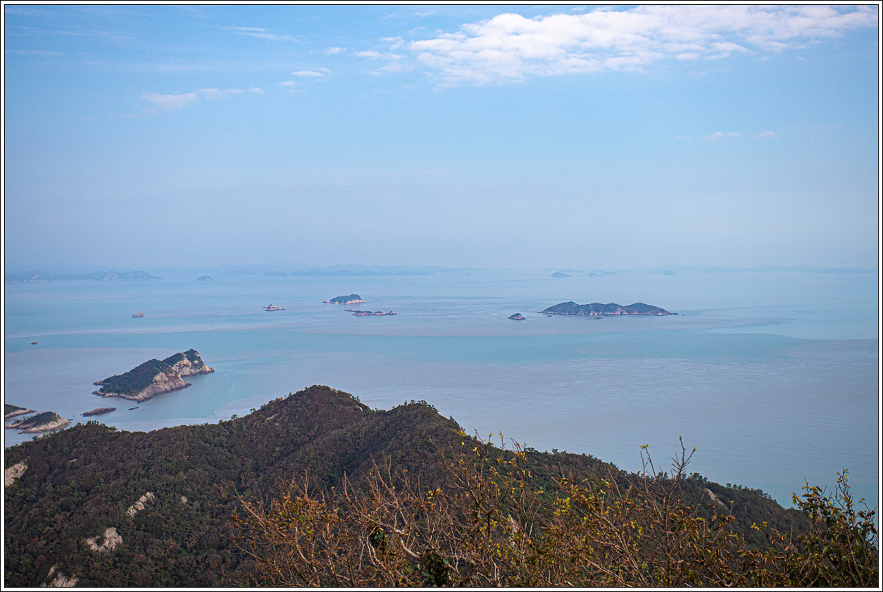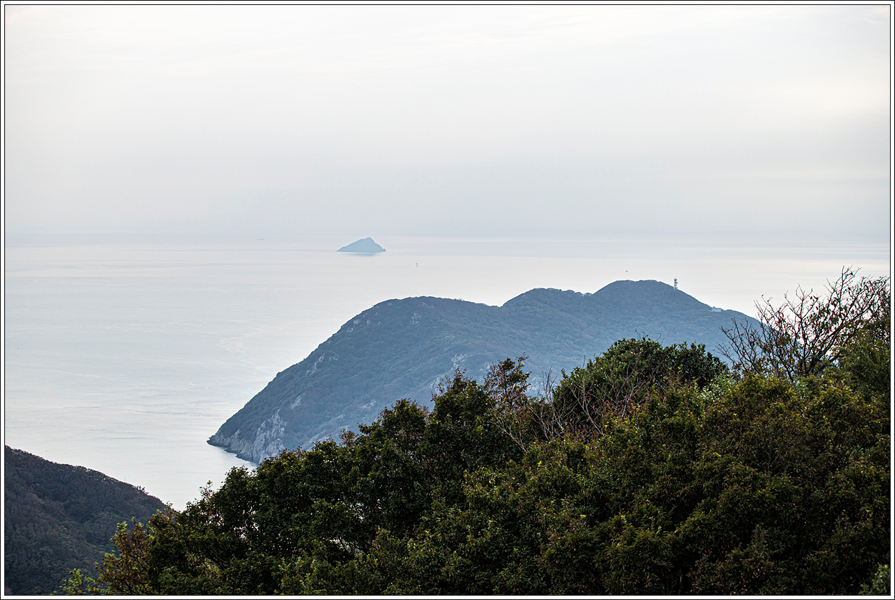 ▽ 건너편 도초도와 우이도 중간쯤에 위치한 경치도...왼쪽 멀리 자은도의 두봉산(364m)과 오른쪽 멀리 암태도의 승봉산(356m)이 희미하게 잡혔다.