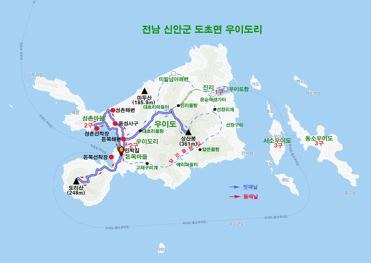 ▽ 우이도에서 온전히 1박을 한다면 모를까 오늘처럼 15:40에 도착하여 점선으로 된 등로로 진리까지 한바퀴 돌아 본다는 것은 쉽지 않은 일이다. 오늘처럼 민박집에 짐 정리를 하고 상산봉에 왕복으로 갔다 오느니 거리상 차라리 우이도항에서 하선하여 상산봉을 오르고 돈목마을 민박집으로 이동 하는 방법이 문순득생가터나 정약전 적거지등을 들러 볼 수 있는 기회가 된다는 점에서 훨씬 나은 코스라 여겨진다.