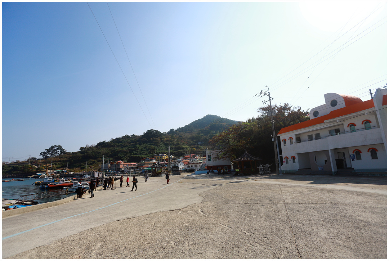 ▽ 마을로 내려와 배가 오기 전까지 오른쪽 흰 건물 앞의 정자에서 쉬면서 간식을 먹기로 한다.