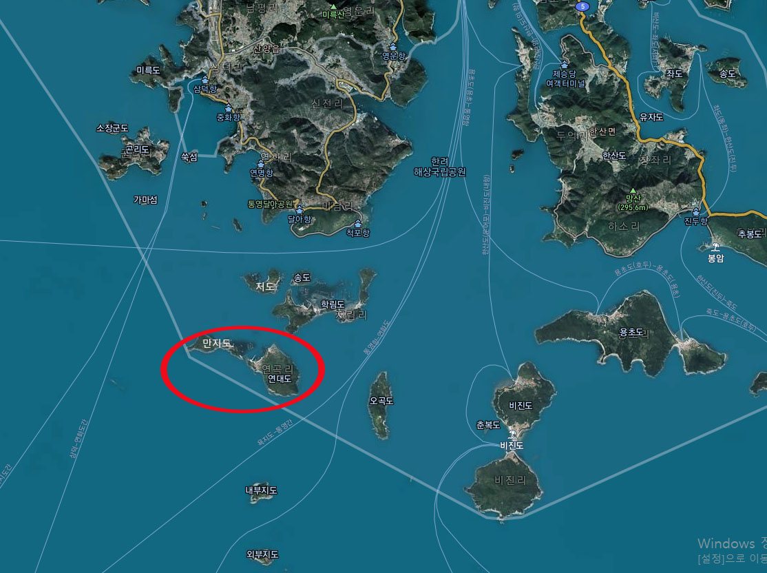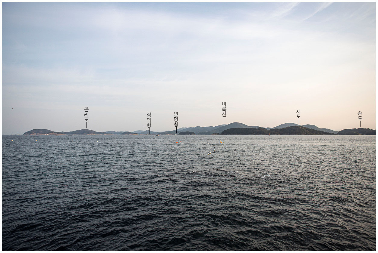 ▽ 왼쪽은 연대도 일부가 보이고 가운데 멀리 작은 섬은 소지도, 오른쪽은 내부지도, 그 뒤로 외부지도가 자리하고 있다.