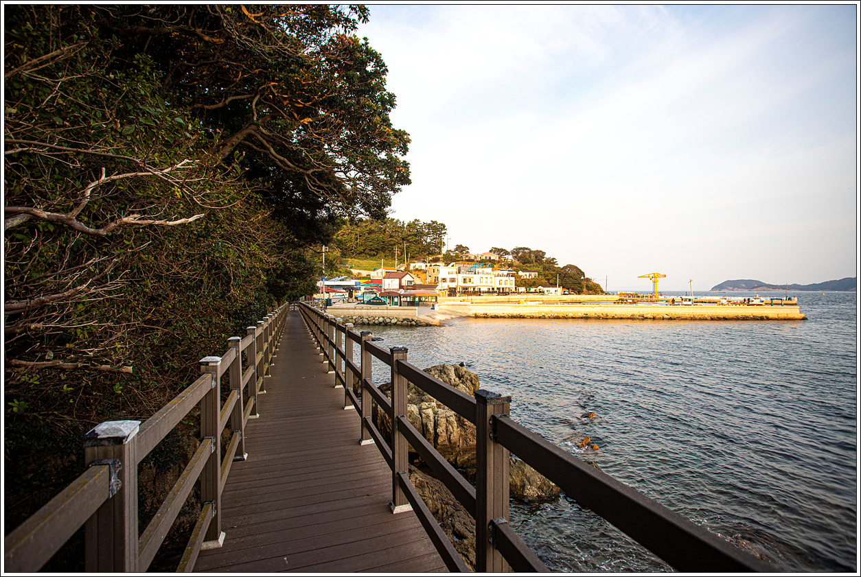 ▽ 후박나무 아래로 곧게 뻗은 데크길을 지나면 만지도 마을과 선착장이 나온다.