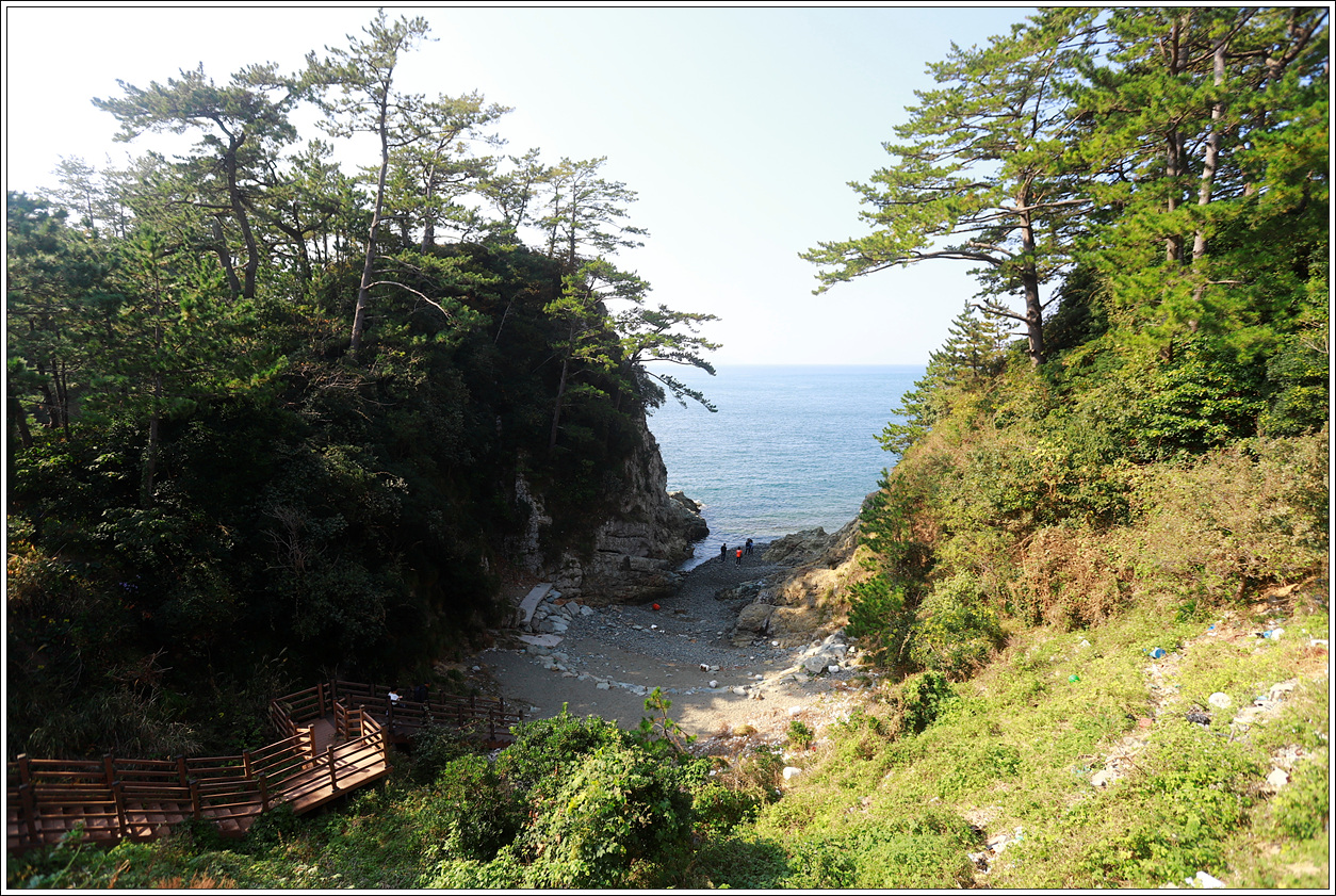 ▽ 왼쪽 계단을 내려와 아담한 몽돌해변을 둘러본다. 멀리는 내부지도가 반달같이 보인다.