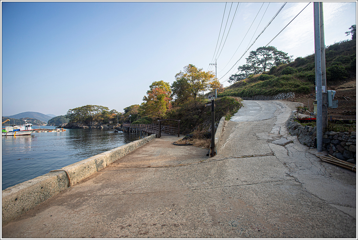 ▽ 하선하여 방파제를 따라 마을로 이동, 왼쪽은 연대도, 출렁다리 넘어 오른쪽은 만지도이다.