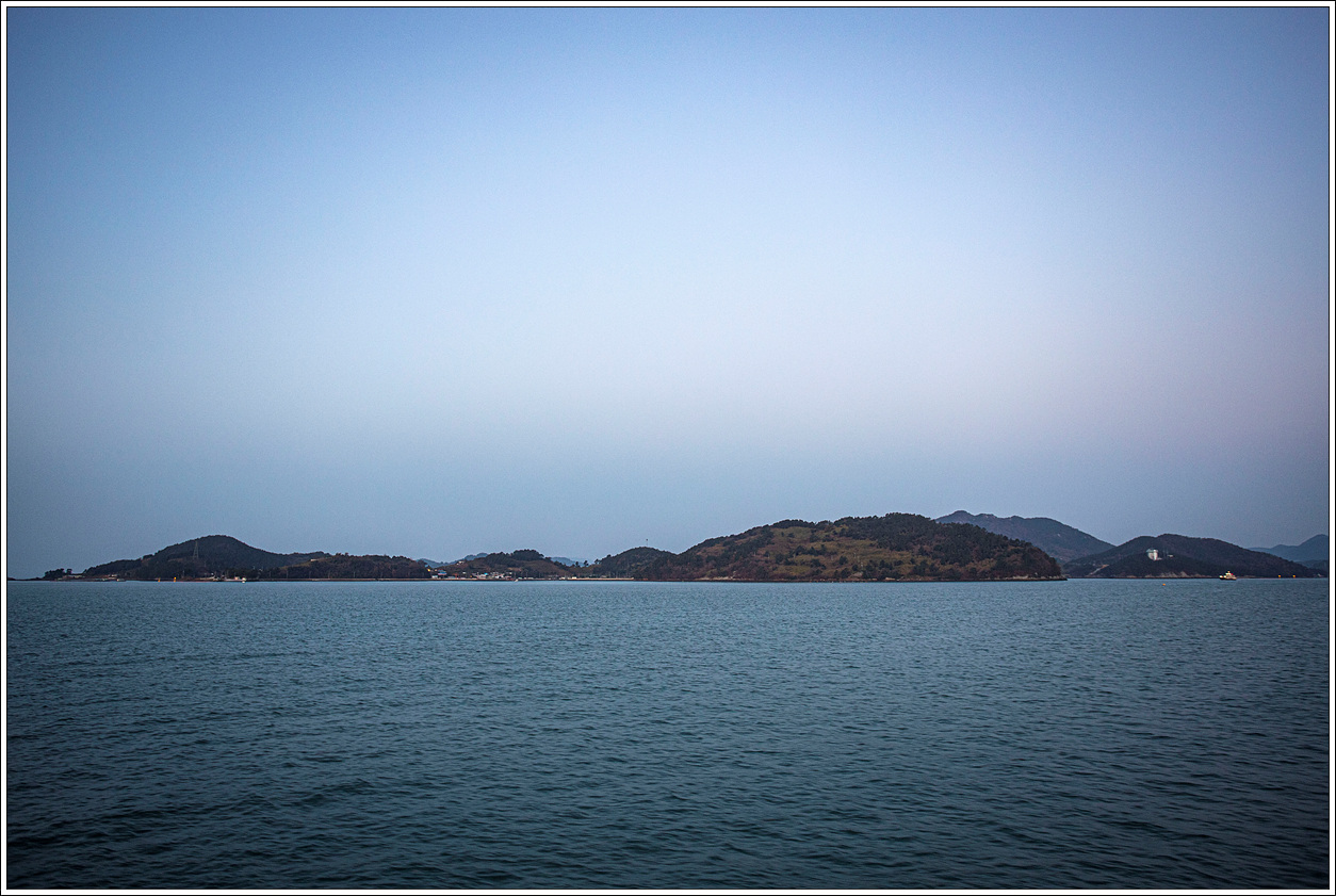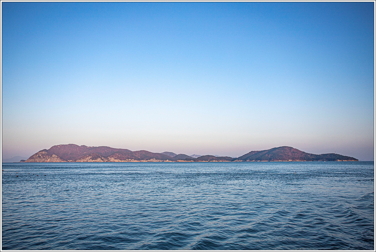 ▽ 날이 서서히 밝아 오면서 서쪽 방향의 <제도>가 눈에 들어온다. 오른쪽의 뒷편으로 백야도의 백호산이 살짝 보인다.