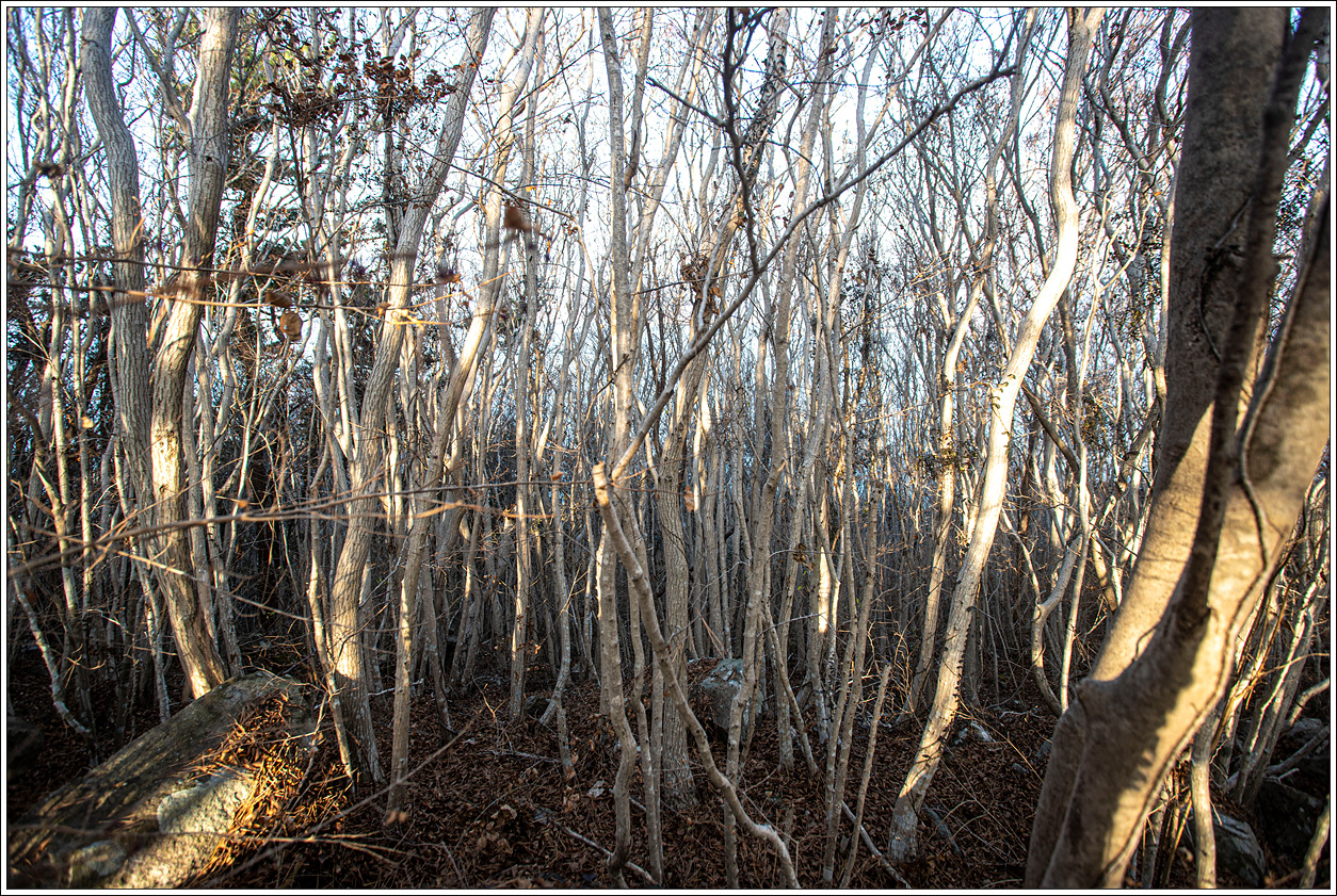 ▽ 매봉산 아래는 상록수 일색이었는데 7부 능선쯤 올라서자 거의 소사나무의 흰 수피만 보인다.