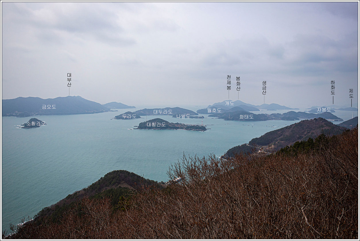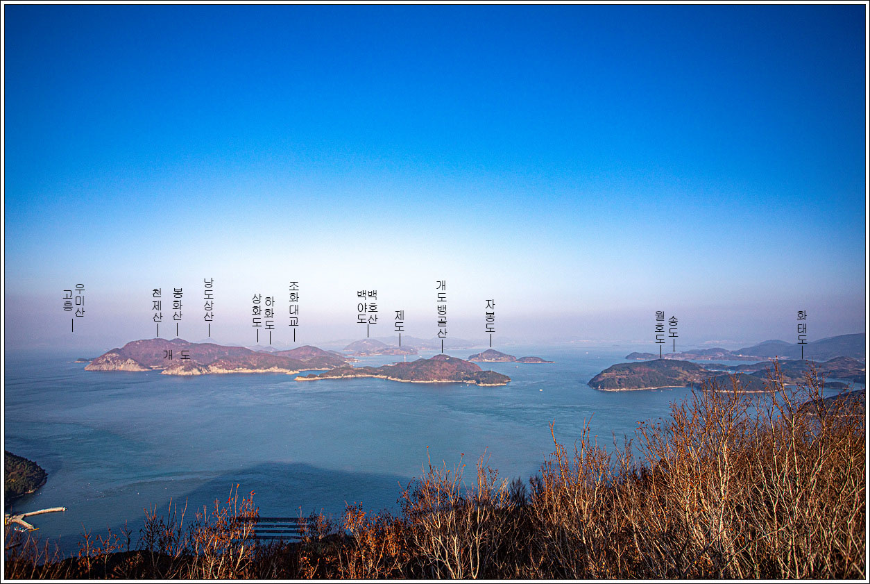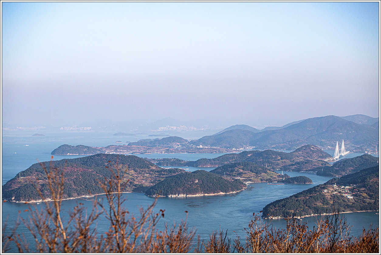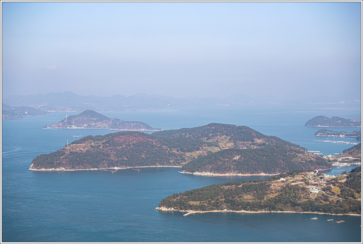 ▽ 당겨 본 개도의 천제봉과 봉화산, 그 뒤로 멀리 뾰족하게 올라온 낭도의 상산, 바로 오른쪽으로 상화도, 하화도, 조화대교가 있는 조발도 등이 한눈에 들어온다.