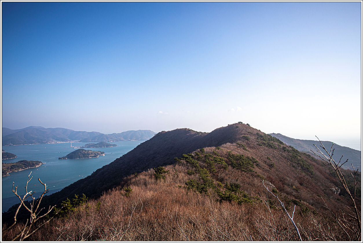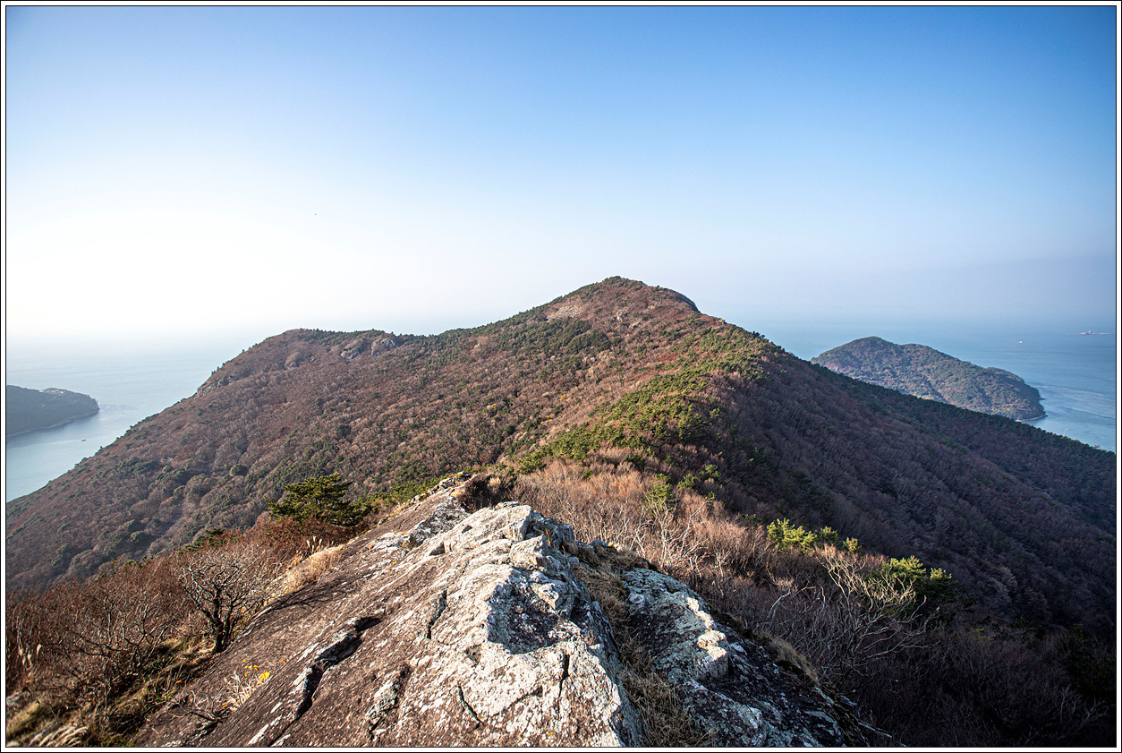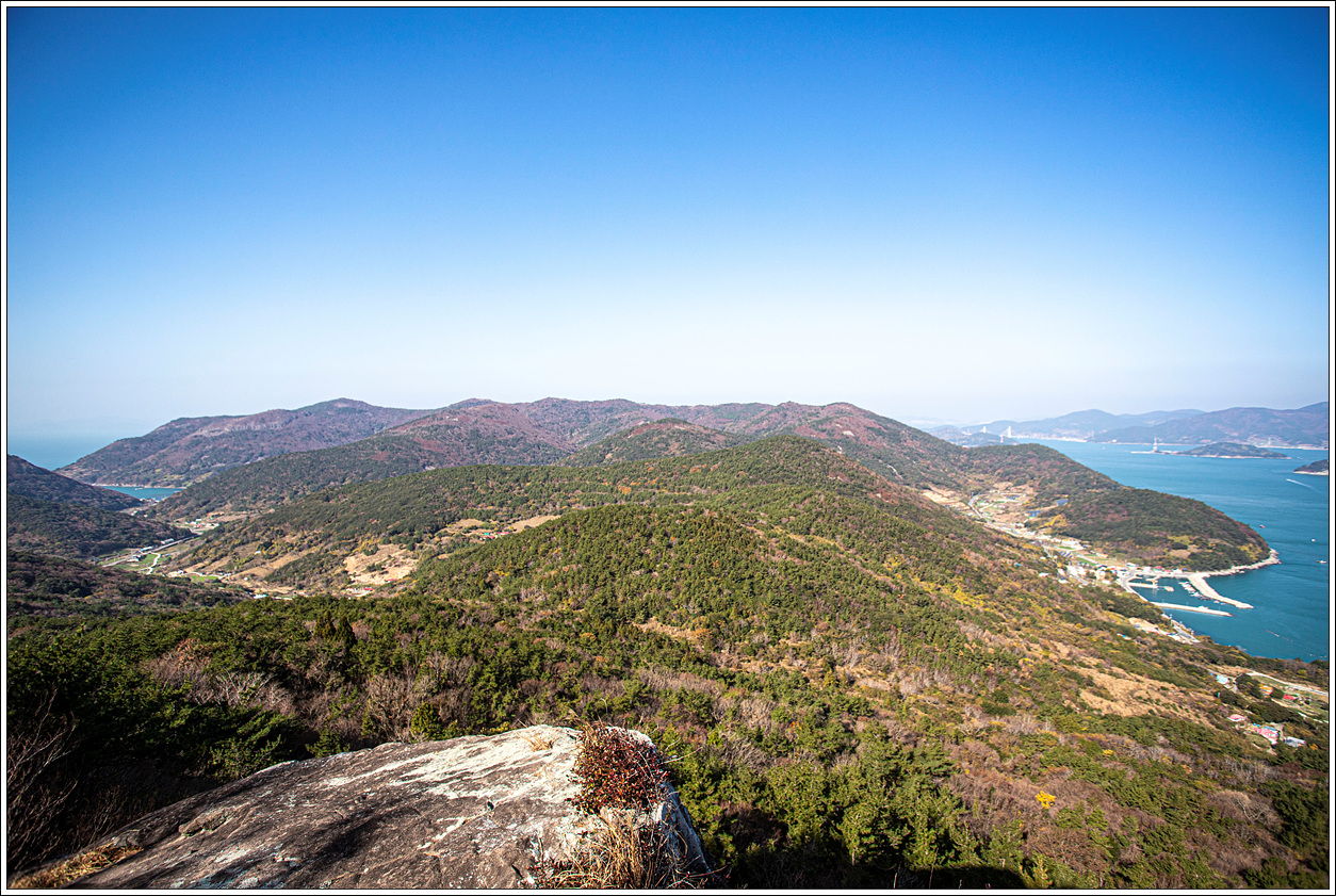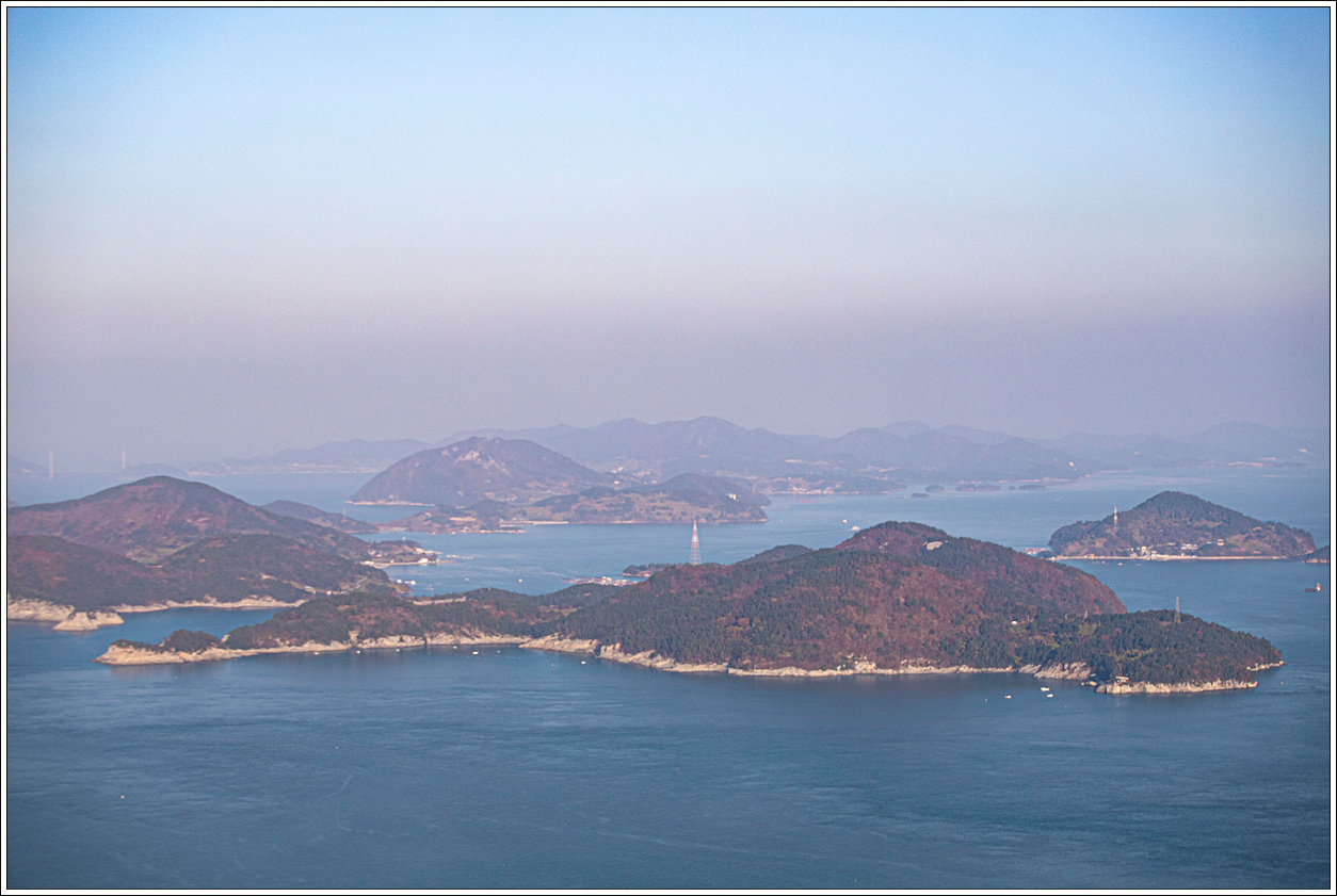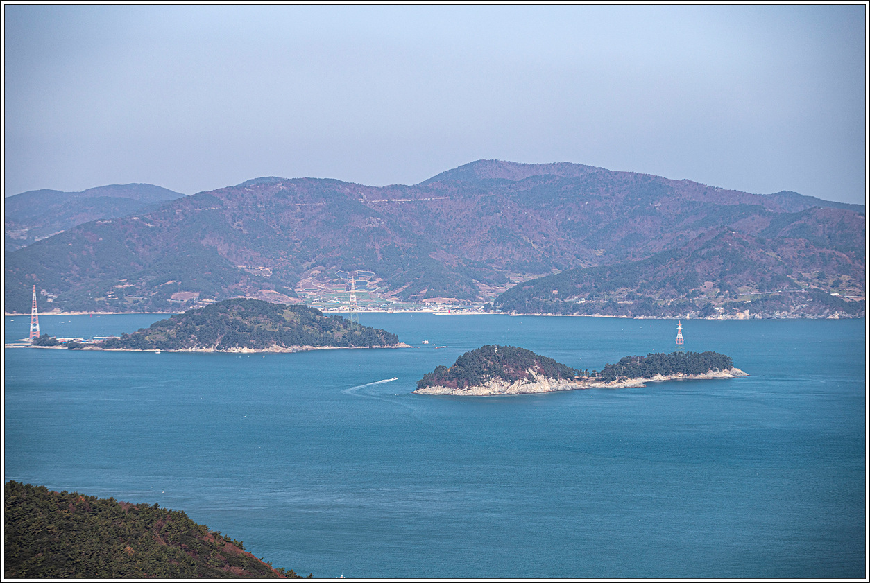 ▽ 당겨 본 개도의 천제봉과 봉화산, 그 뒤로 멀리 뾰족하게 올라온 낭도의 상산, 바로 오른쪽으로 상화도, 하화도, 조화대교가 있는 조발도 등이 한눈에 들어온다.