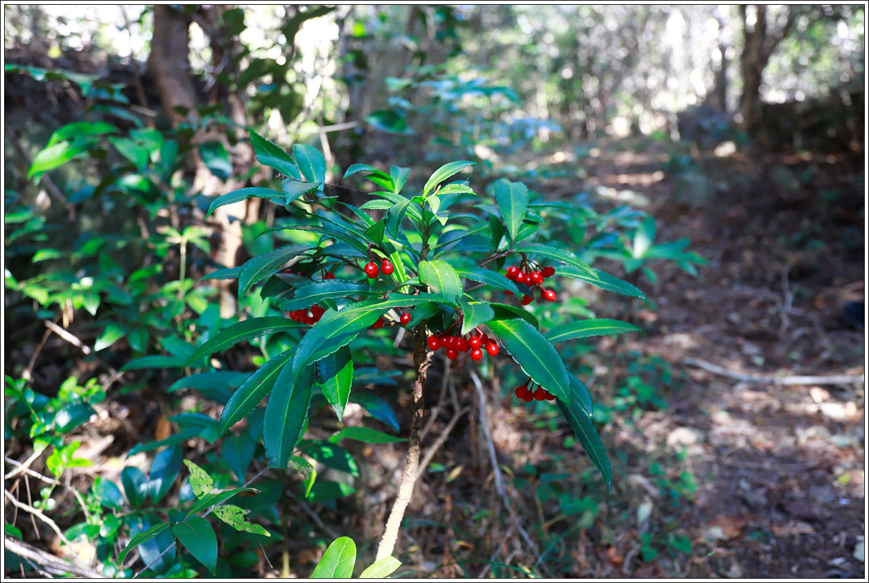 ▽ 젊어서 한 때는 아파트 베란다에 화초를 키우는 것이 취미여서 많은 식물을 키웠는데 그중에 아래의 <백량금 Ardisia crenata>도 키웠었다. 이렇게 야생에서 보는 것도 처음이어서 신기하기까지 하다. 이 식물은 열매가 비슷한 자금우과(紫金牛科)로 천냥금이라는 별명도 갖고 있는데 <산호수>와 더불어 '열매보기 식물 삼총사'로 불리기도 한다.