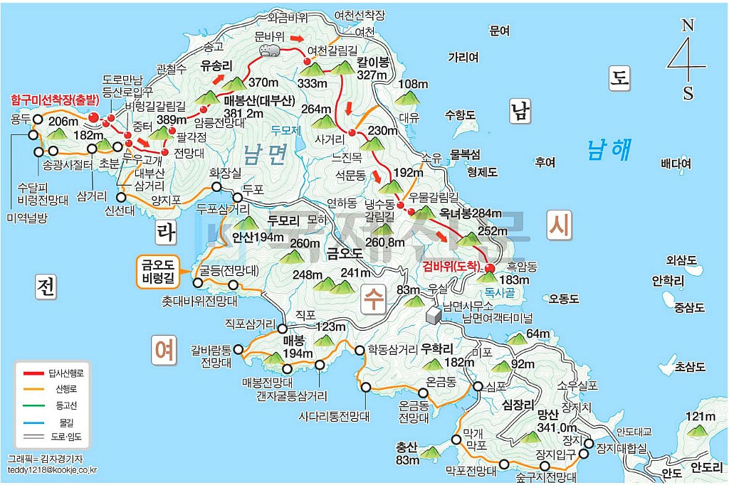 ▽ 금오도는 비렁길 트레킹 5개 코스와 매봉산(대부산)을 오르는 산행코스로 구분된다. 산행코스는 함구미선착장에서 검바위 등산로 입구까지 10.5km가 실제 산행거리이고 1.4km는 아스팔트 포장도로로 버스 정류장이 있는 우실삼거리까지 걷게 된다. 우실삼거리 버스정류장에서 여천선착장까지는 마을 내 버스를 이용한다. 물론 검바위 등산로 입구에서 여천선착장까지는 배 출항 시간 이전까지 걸어갈 수 있으나 아스팔트 길을 두 시간 가량 걸어야 한다는 점에서 무리일 수밖에 없다.