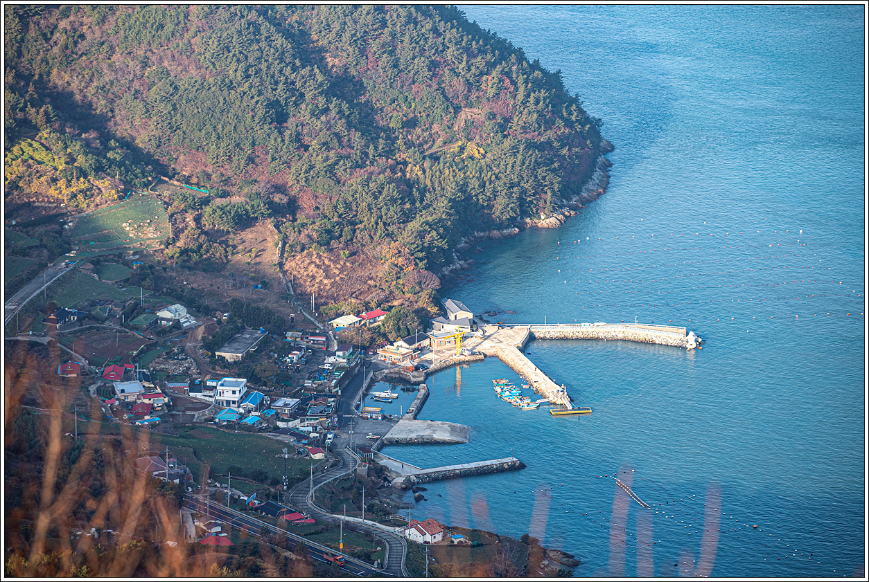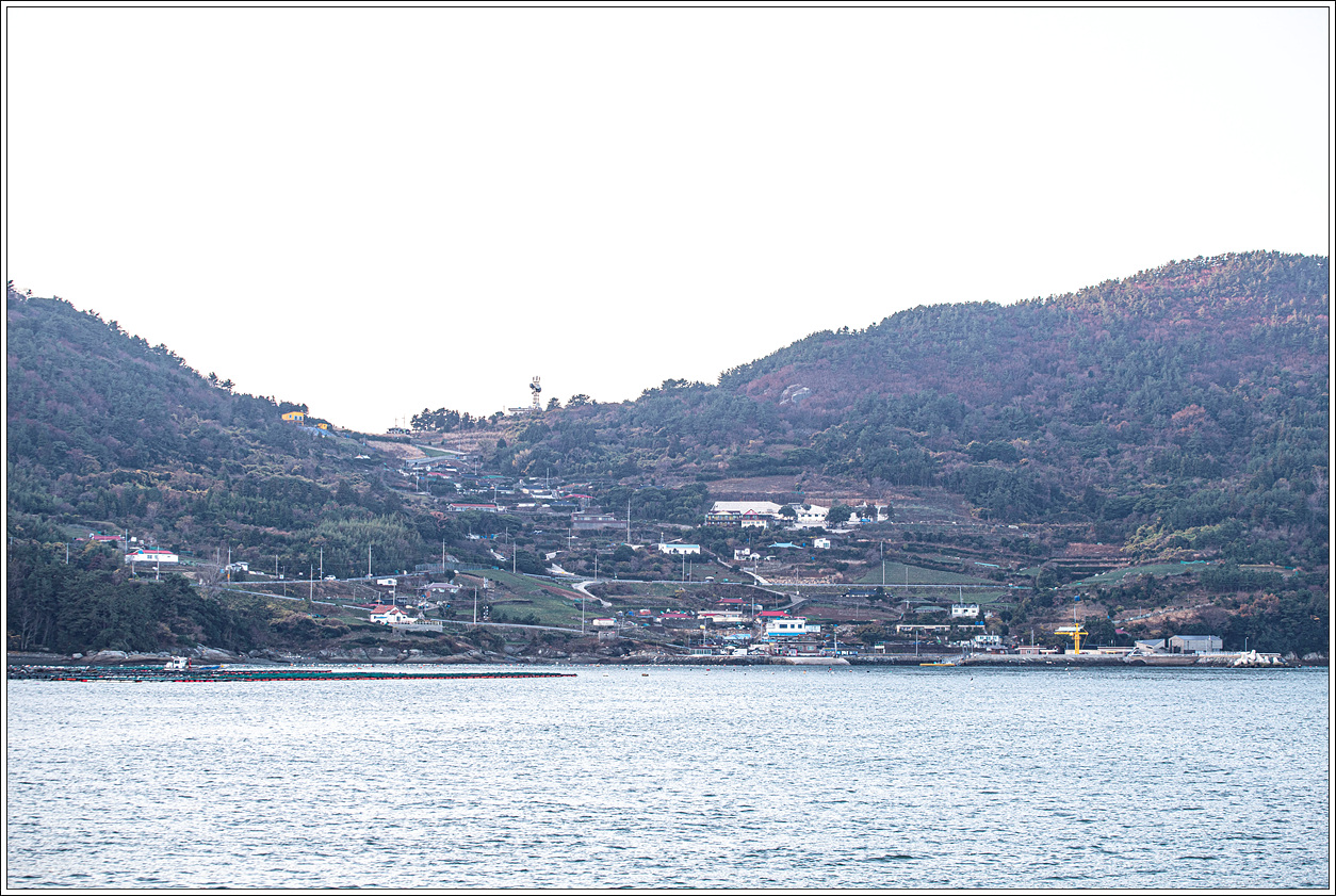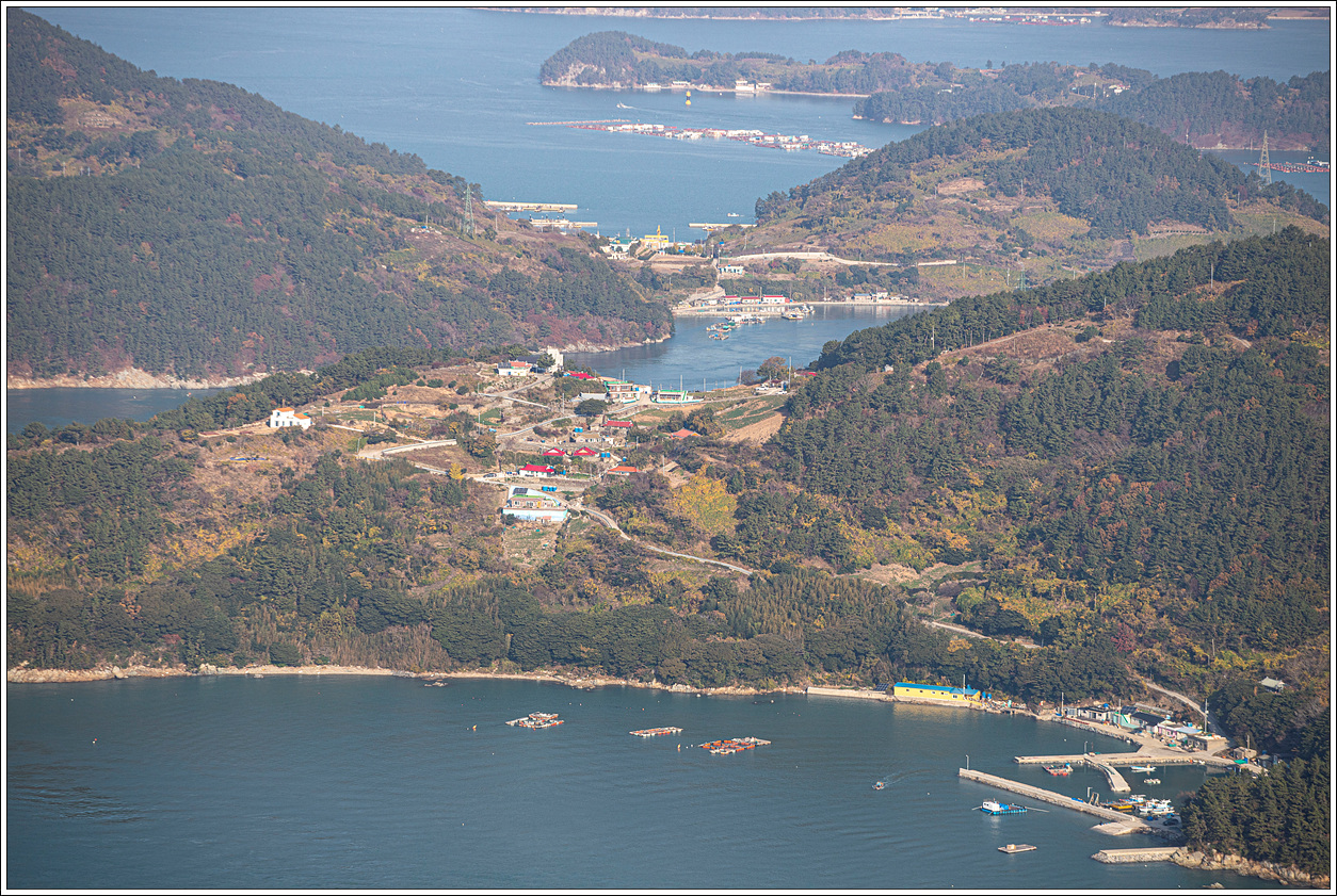 ▽ 대유마을과 오른쪽 소유마을 그리고 작은 수항도가 조망되는 가운데 멀리 돌산도의 금오산 자락도 보인다.